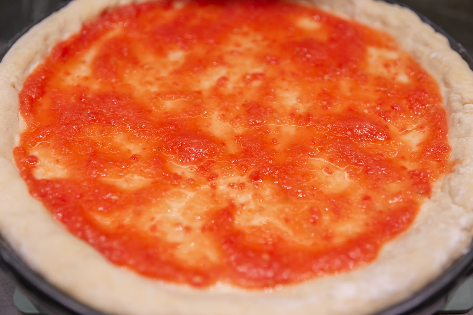 Дождавшись, когда тесто увеличится в объеме, достаем его и выкладываем на присыпанную мукой поверхность. Включаем нагрев пиццамейкера на максимум, обминаем тесто и руками (никаких скалок) растягиваем до 30-сантиметрового круга. По достижению максимальной температуры отключаем прибор и на смазанную небольшим количеством масла поверхность выкладываем тесто. Разравниваем его и смазываем тонким слоем томатного соуса.