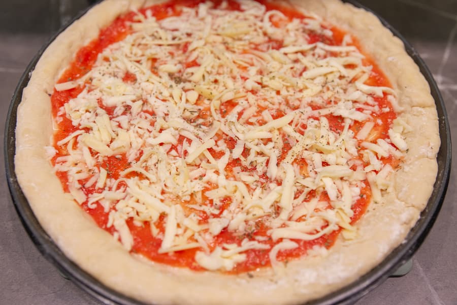 Для начинки мы использовали два вида моцареллы. Томатный соус присыпаем тертой моцареллой с пониженным содержанием влаги (полутвердой), затем снова добавляем небольшое количество томатного соуса, сверху выкладываем кусочки свежей моцареллы, а между ними нарезанные на половинки помидоры черри.