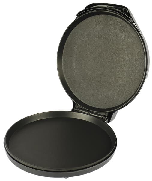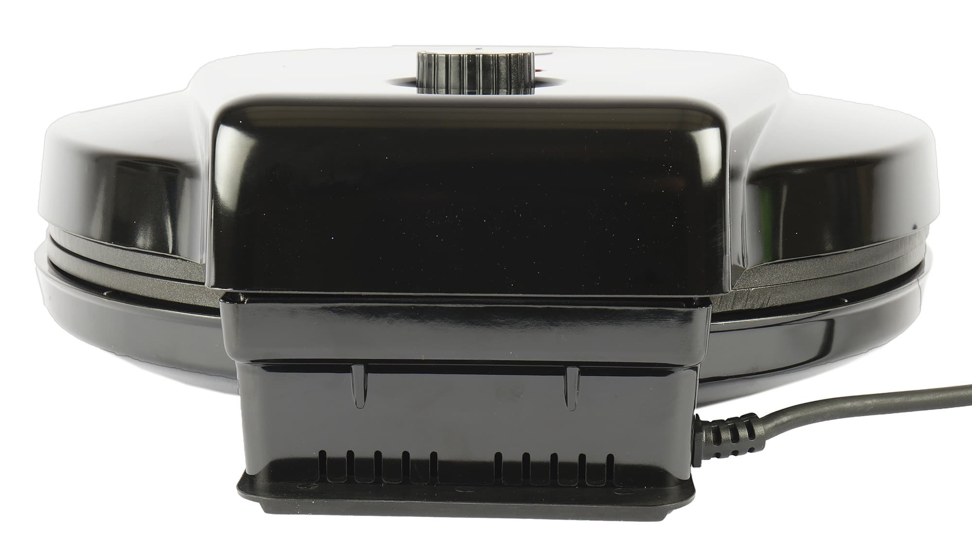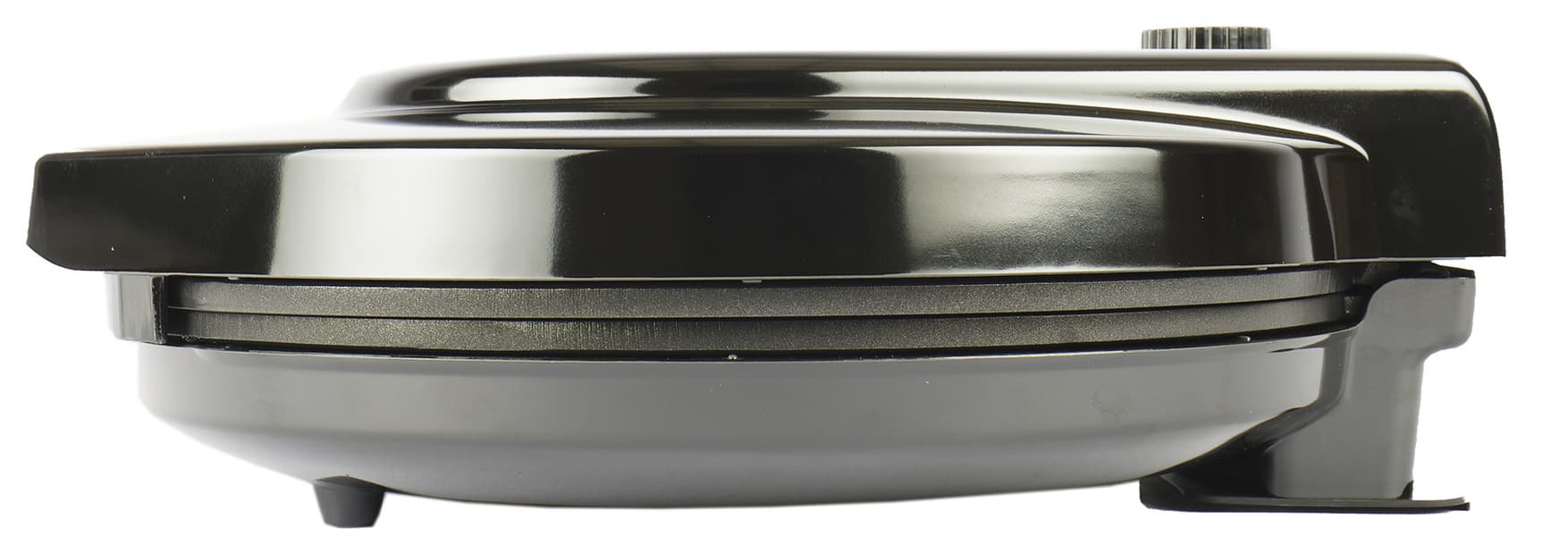 На внутренней стороне крышки есть пространство для захвата пальцами, так чтобы открыть прибор не обжигаясь. Производитель предупреждает, что корпус устройства нагревается. Крышка откидывается на 90°. Панели диаметром 30 см имеют бортики, расстояние между ними составляет около 4 см. Глубина нижней и верхней формы одинакова.