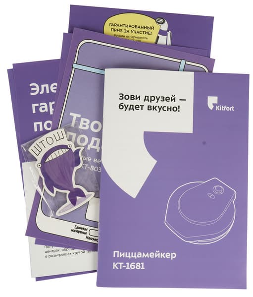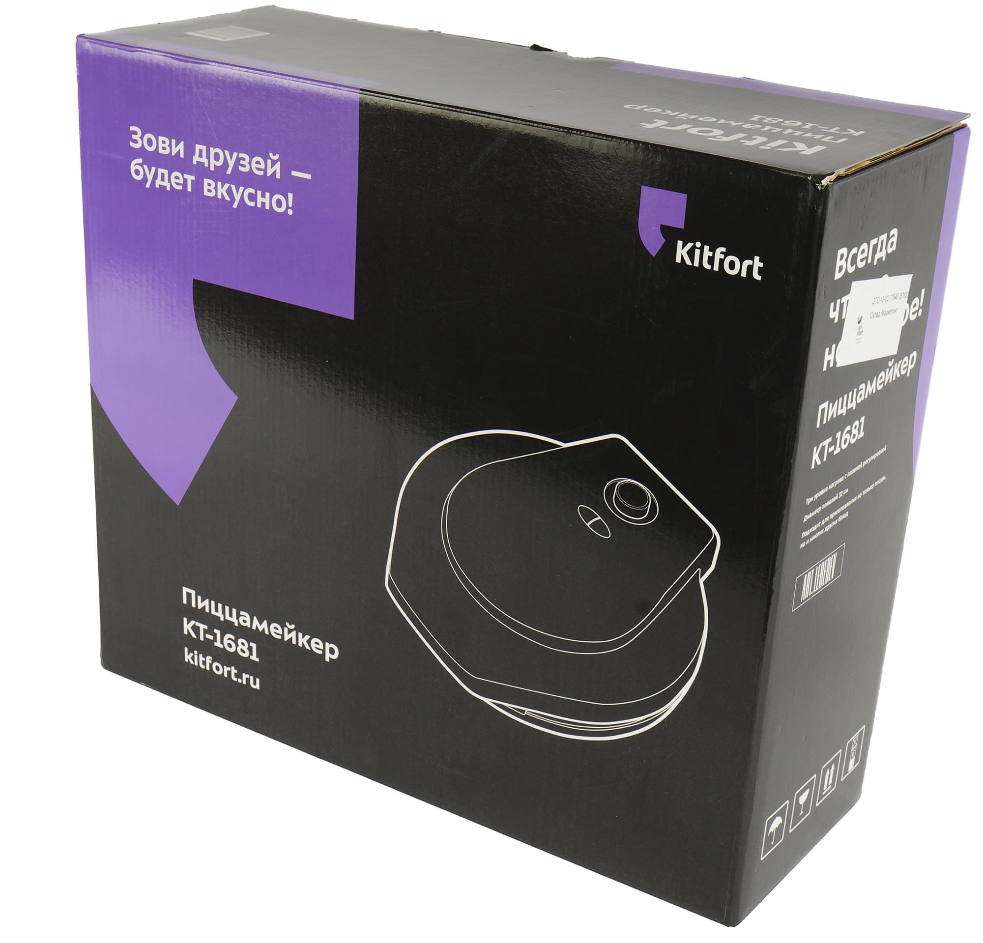 Пиццамейкер поставляется в коробке из прочного картона с узнаваемым дизайном Kitfort: черный фон с фиолетовыми элементами, векторное изображение прибора, название модели и ее ключевых особенностей, а также шутливый слоган, как визуальная коммуникация бренда, настраивающая потенциального пользователя на позитивное восприятие.