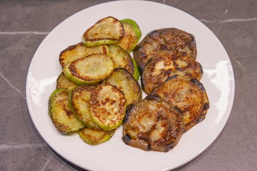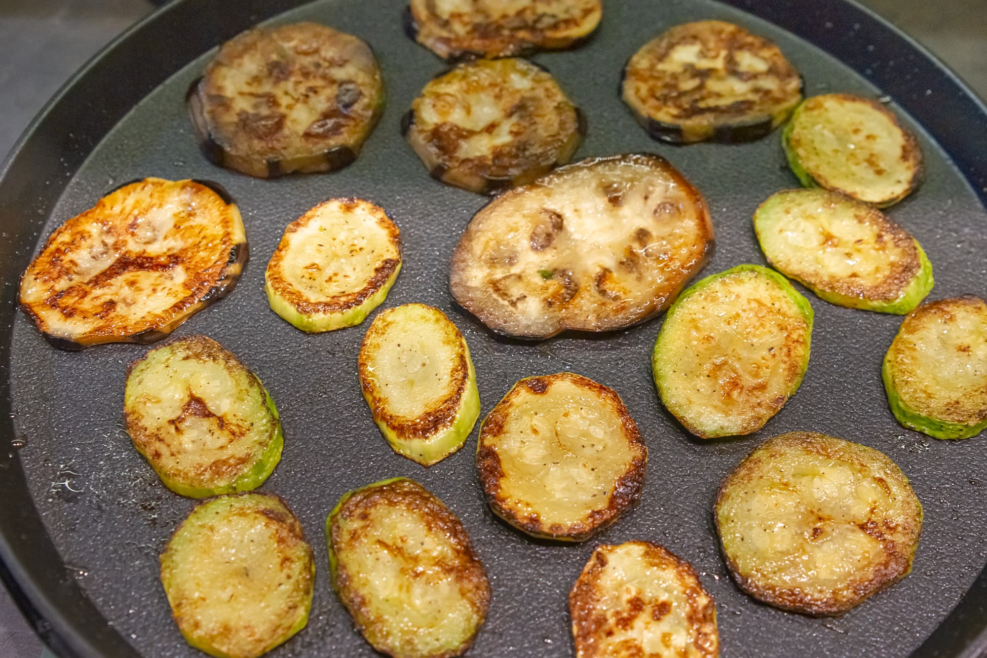 Баклажан почти полностью очистили от шкурки, нарезали кружочками, поместили в подсоленную воду, а по истечении получаса промыли его и обсушили. Кабачок также кружками разложили в один слой, посыпали солью и дождались пока он пустит сок. Ручку регулятора мы выставили на 2, откинули крышку, смазали панель растительным маслом (его требуется буквально чуть-чуть) и дождавшись окончания нагрева выложили подготовленные овощи. Периодически переворачивая, постепенно довели их до готовности.