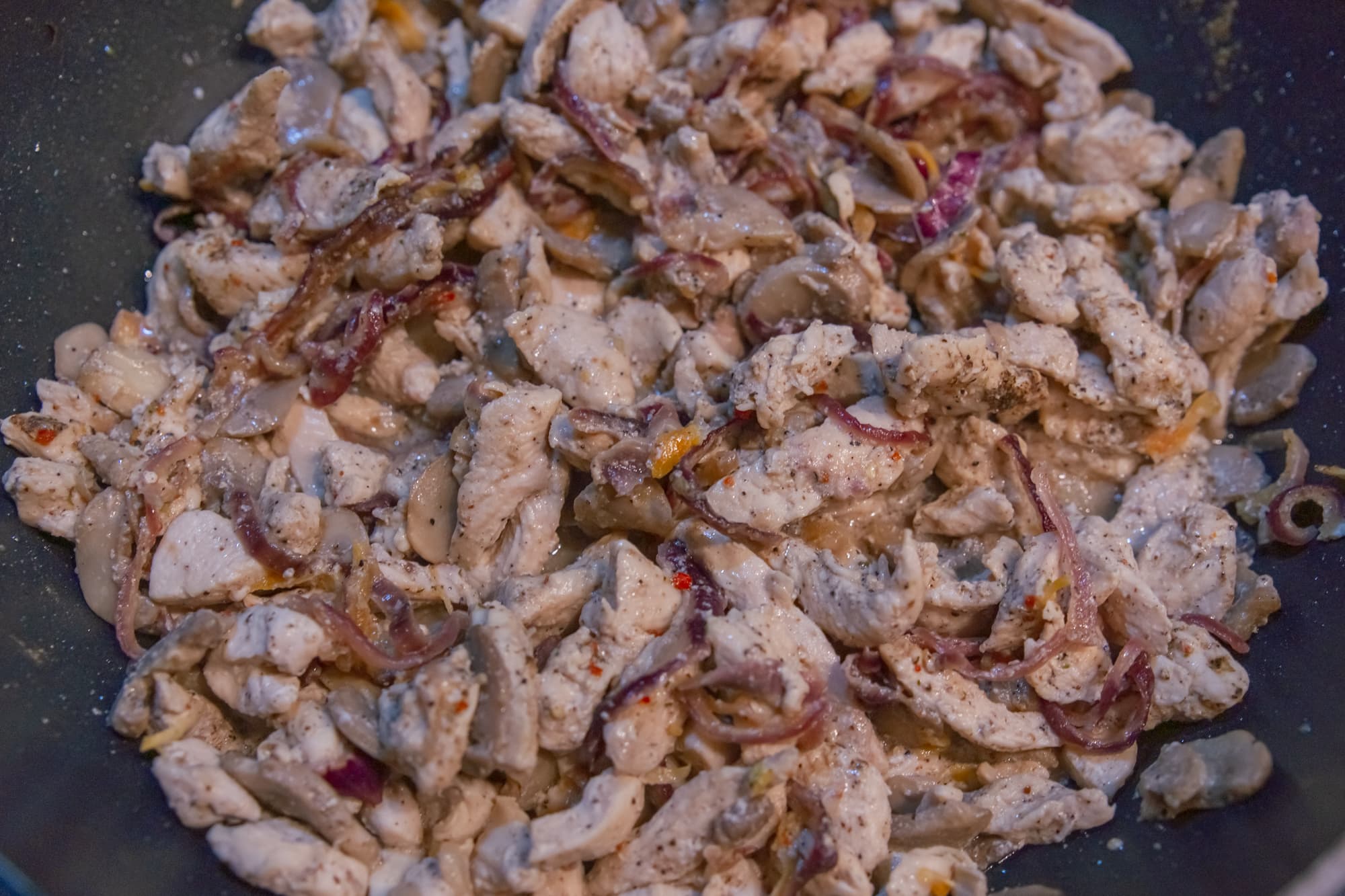 Тем временем, приступили к начинке. Некрупно нарезанную курицу, вместе с шампиньонами обжарили в растительном масле. Под конец добавили небольшое количество сушеного красного лука, подлили сливок и оставили томиться под крышкой.