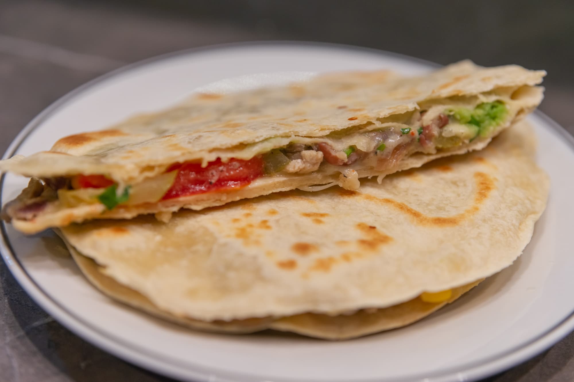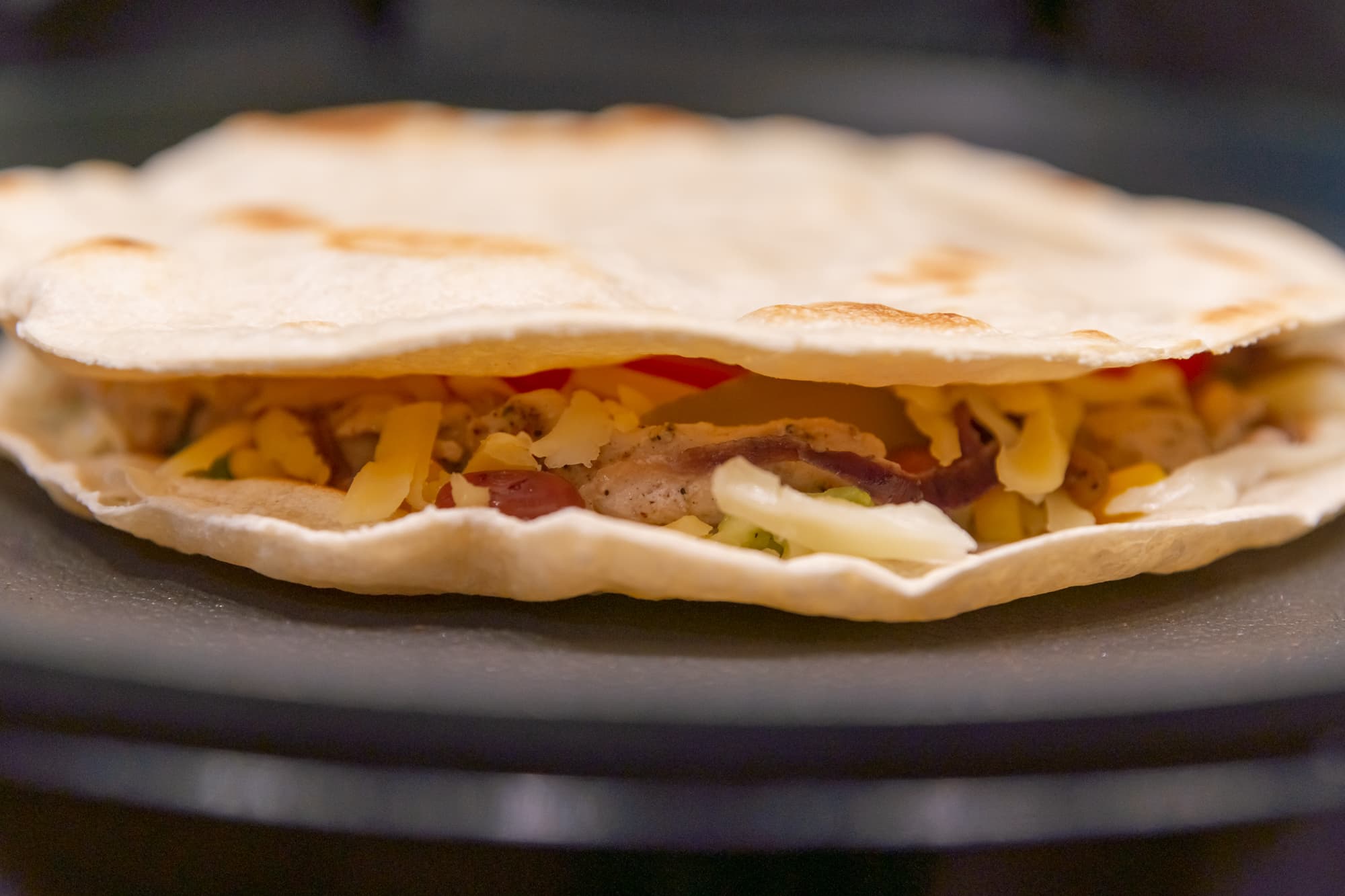 Составляющие начинки выложили на лепешку в следующем порядке: авокадо, курица с грибами, фасоль, кукуруза, помидоры, соленый огурец и тертый сыр. Сверху накрыли второй лепешкой и отправили в пиццамейкер. Крышку держали закрытой.