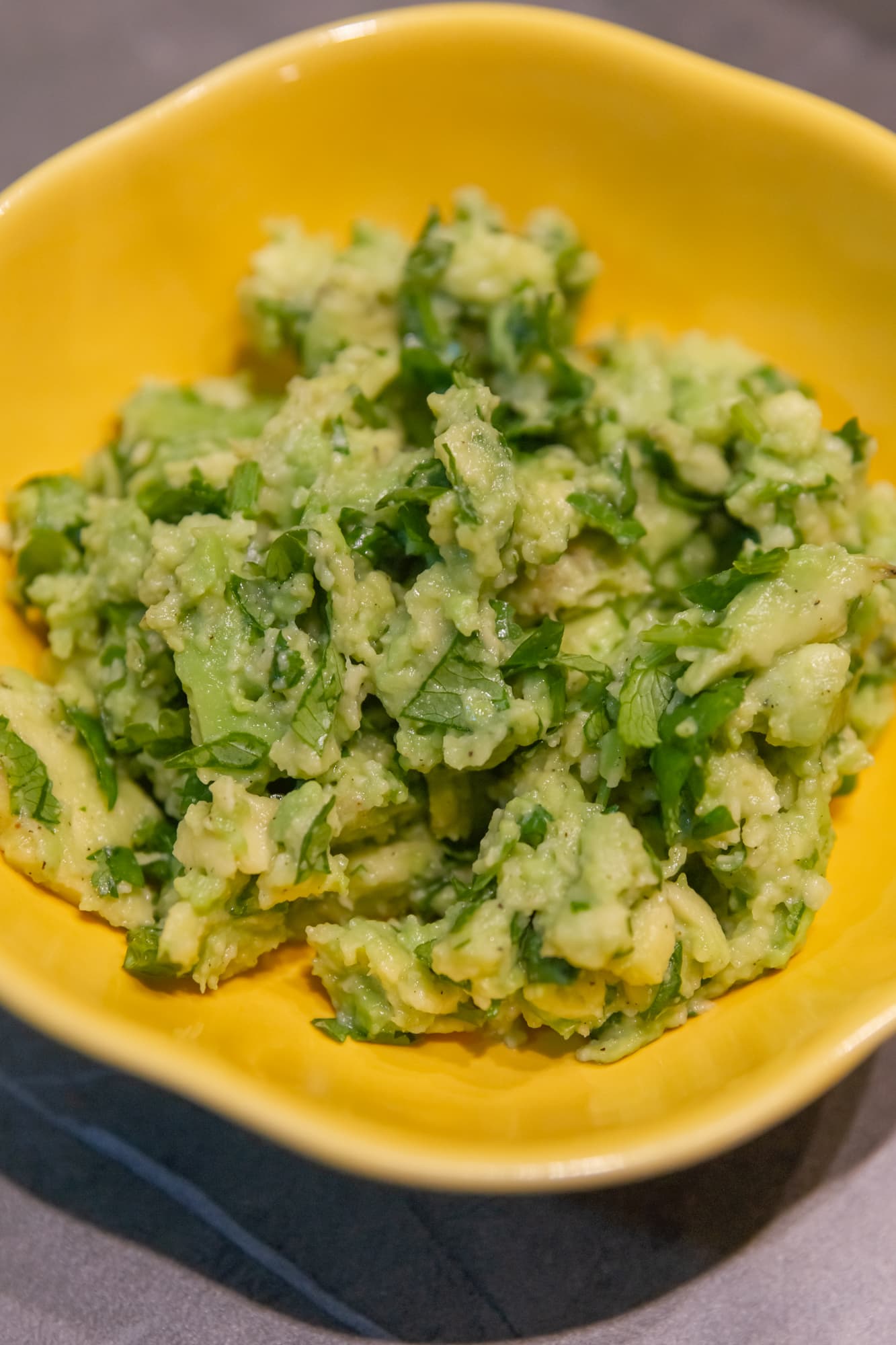 Помидоры нарезали на дольки, посолили и поперчили. Авокадо размяли, сбрызнули лимонным соком, подсолили и смешали с мелко нарубленной кинзой. На крупной терке натерли сыр.