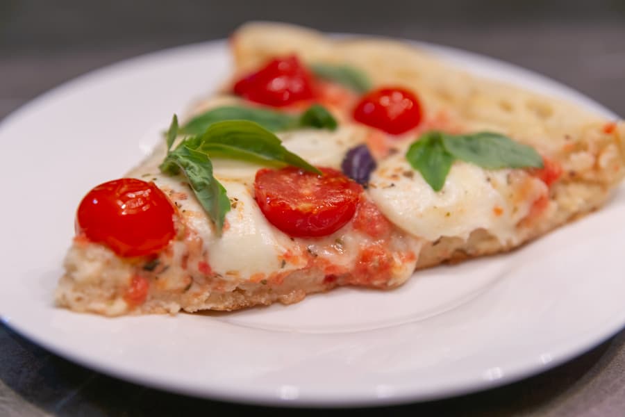 Мы отключили нагрев и оставили пиццу под крышкой еще минут на 5. Сыр полностью расплавился, низ пропекся и получился хрустящим, тесто по всей плоскости пиццы пропеклось как следует и не пересушилось, но верхушки бортиков так и остались бледными, а жаль. Сверху присыпали свежими листиками базилика и перешли к дегустации. Пусть и бледная по краям, но пицца вышла очень хорошо.
