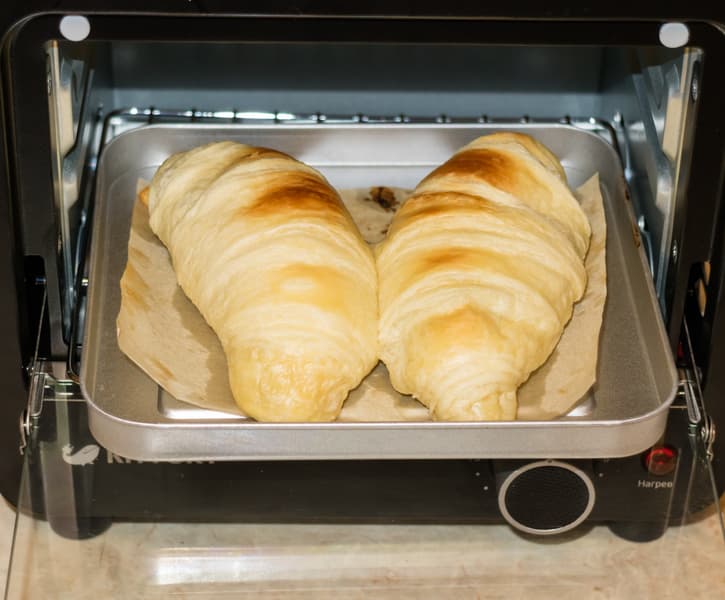 Установили на нижнюю несъемную решетку и выкрутили ручку таймера до максимума. Время пошло, таймер затикал. Через 10 минут круассаны сильно увеличились в размерах, однако поверхность их лишь слегка подрумянилась.