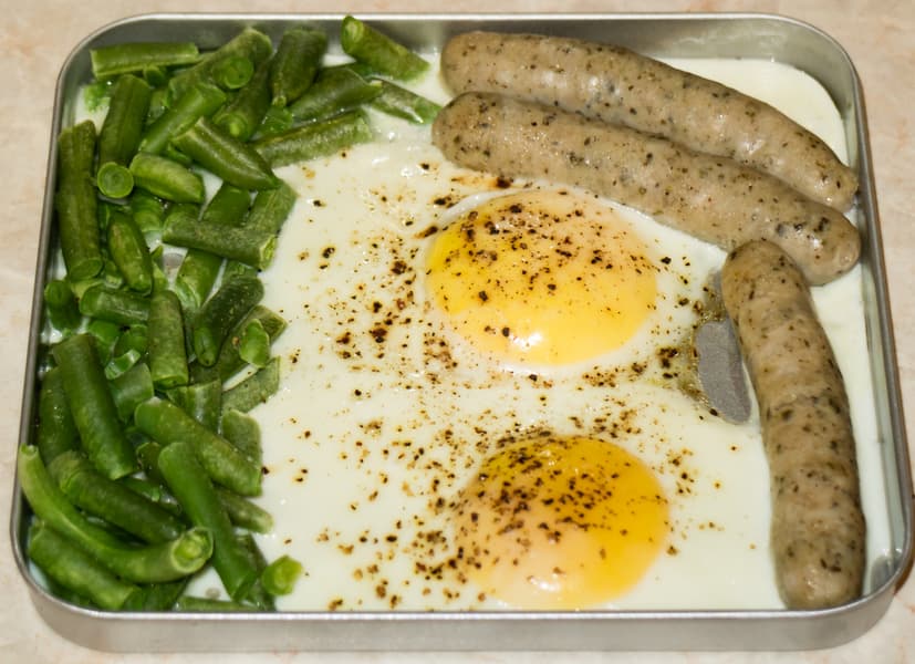 Колбаски прогрелись и слегка поджарились, яйца полностью, включая желток, приготовились, а вот стручковой фасоли времени не хватило — продукт был жестковатым. К яйцам и колбаскам следовало бы добавить предварительно бланшированную фасоль, тогда бы мы достигли того результата, к которому стремились — приготовили сытный и сбалансированный завтрак.