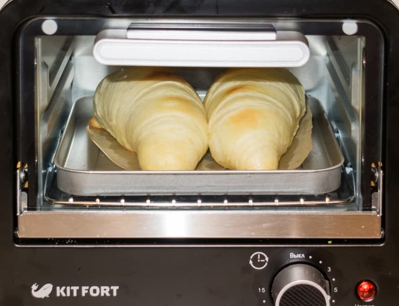Через 10 минут выпечки стало понятно, что значительно слойки в объемах не вырастут, а верхушка у них совсем белая, поэтому переместили противень в середину камеры. Задали еще 10 минут выпечки.