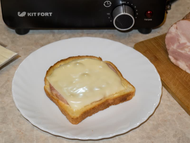 Уложили бутерброд также по центру на съемной решетке. Выпекали 6 минут. Результат оказался идентичным предыдущему: хлеб поджарен снизу, начинка слегка прогрета, сыр расплавлен.