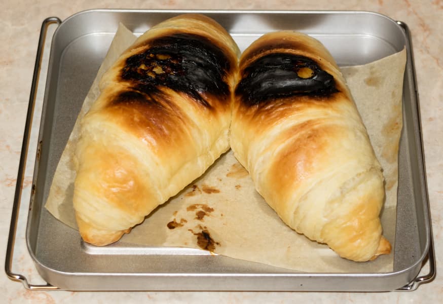 Через пару минут из печи запахло гарью, и повалил дым. Круассаны поднялись и коснулись верхушкой решетки нагревательных элементов. Пришлось экстренно извлекать противень из духовки и счищать налипшие и продолжавшие гореть кусочки теста.
