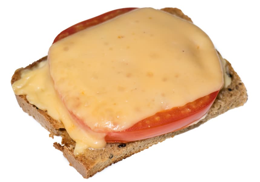 Спустя пять минут хлеб поджарен и хрустит снизу, сыр расплавлен, ломтик томата теплый. Если бы мы хотели, чтобы сыр поджарился, можно было бы продлить жарку еще минуты на 3-4.
