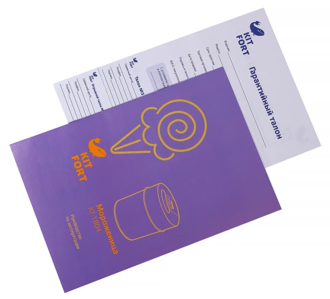14-страничная брошюра формата А5, отпечатанная на качественной глянцевой бумаге, дает полное представление как о самом приборе, так и о правилах его эксплуатации. Любопытными и полезными представляются нам общие советы по использованию мороженицы, а также набор рецептов. В данном случае их наличие мы считаем довольно важным: все-таки мороженица — довольно нишевый прибор, а следовательно — практически каждый пользователь, который впервые приобрел такое устройство для дома, будет вынужден заняться поиском подходящих рецептов. Очень удобно, что за ними не нужно будет отправляться в интернет.