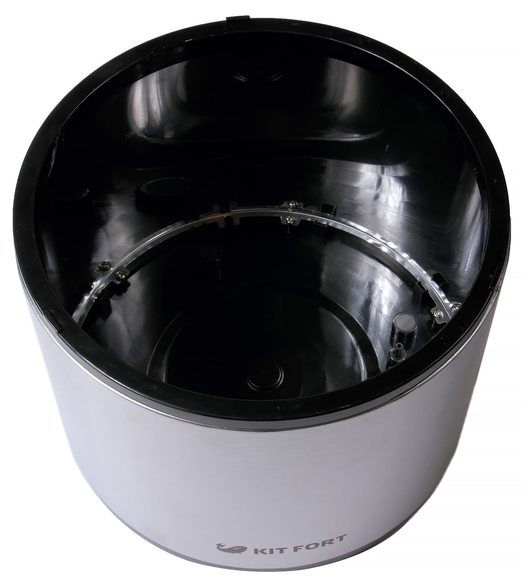 Внутри пластикового «ведра» находится металлическое крепление для чаши. Снаружи корпус оформлен металлическим листом, на котором отпечатан логотип Kitfort.