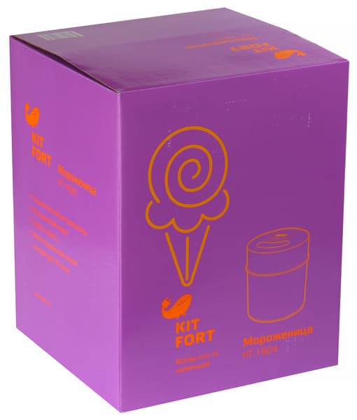 К нам в руки прибор попал в цветной коробке из гофрированного картона. Упаковка оформлена в свойственном для Kitfort лаконичном стиле. Изучив коробку, можно найти основную информацию об устройстве: модель, тип, краткие технические характеристики, а также векторное изображение прибора. Внутри коробки мороженица оказалась защищена от ударов и повреждений с помощью пенопластовых вкладок и полиэтиленовых пакетов. Ручкой для переноски упаковка не оснащена.