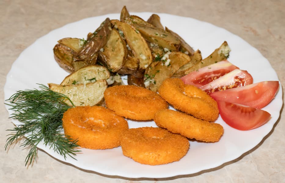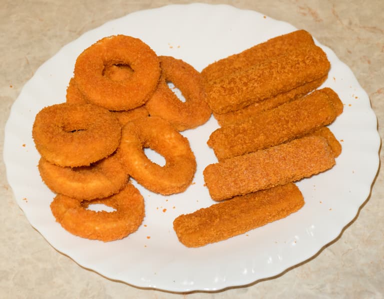 Выложив кольца на тарелку, выстланную бумажной салфеткой, поместили в корзину 8 рыбных палочек (200 г). Когда погас индикатор нагрева, поместили корзину в ванну с маслом. Жарили в течение четырех минут.
