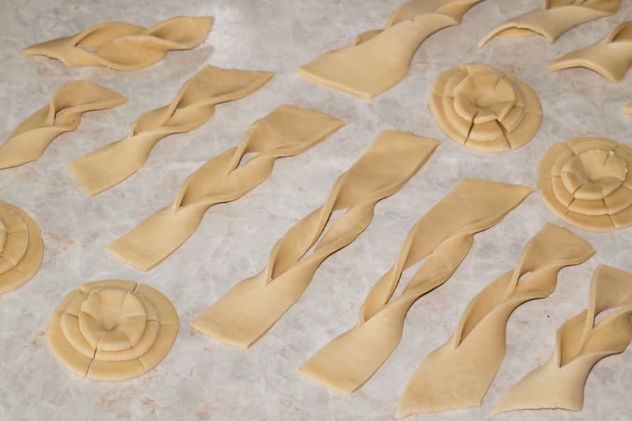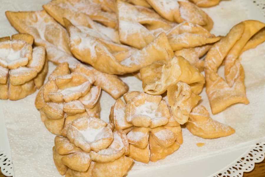 Поверхность изделий прожарена равномерно. По мере готовности выкладывали на тарелку, накрытую бумажной салфеткой, чтобы избавиться от излишков масла. После того, как печенье остыло, посыпали сахарной пудрой. Печенье получилось хрустящим, легким, нежирным, с тонкими стенками теста и полостями воздуха внутри.