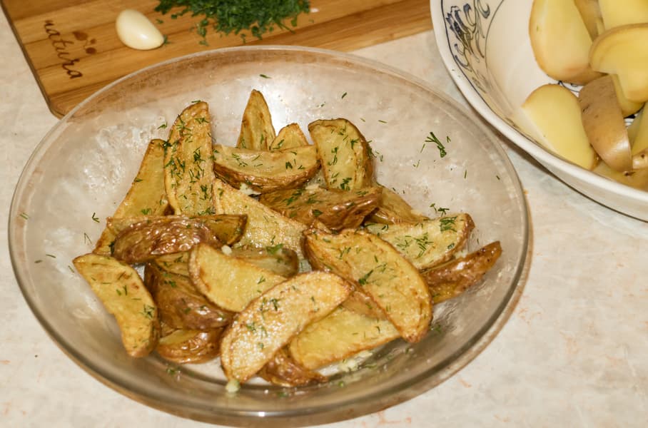 Чеснок и укроп полностью раскрыли свой аромат на горячем картофеле. Сам картофель отлично прожарен, внутри не жирный. Именно хрустящей корочки на нем не образовалось, для этого, полагаем, нужно или использовать другой стиль нарезки и другой сорт картофеля и жарить дольше. Либо воспользоваться готовым полуфабрикатом.
