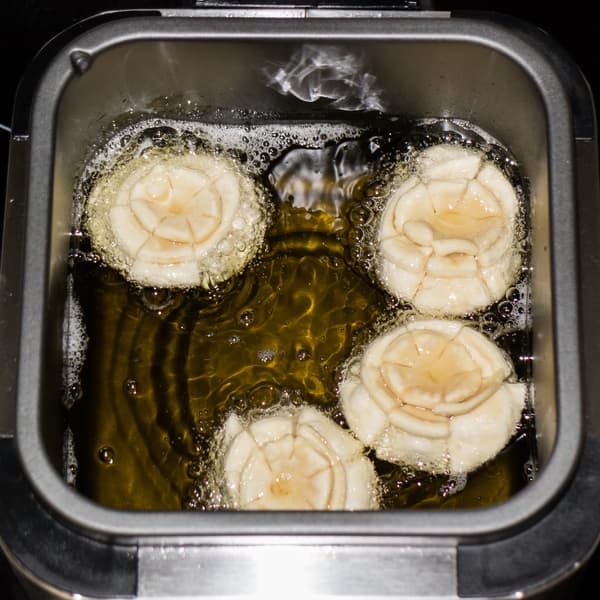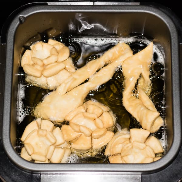 Разогрели фритюр до 180 °C, выложили несколько штук печенья прямо в масло, не используя корзину. Кусочки опускались на дно, через несколько секунд, увеличиваясь в размерах в активно бурлящем масле, поднимались на поверхность.