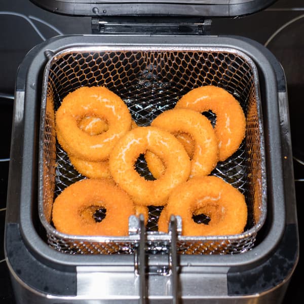 Поместили в корзину 9 колец кальмара общим весом 250 г. Обжарку производили на температуре в 170 °C. Сначала масло бурлило сильно, через некоторое время кипение ослабло. Включился нагрев. Через четыре минуты подняли корзину и закрепили на краю ванны, чтобы стекли излишки масла.