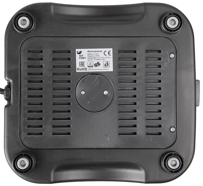 Со стороны дна на корпусе расположены вентиляционные отверстия, наклейка с информацией о приборе и четыре ножки с прорезиненными вставками, противодействующими скольжению фритюрницы по поверхности стола. С правой и левой стороны можно увидеть пазы для рук, чтобы было удобнее переносить прибор с места на место.