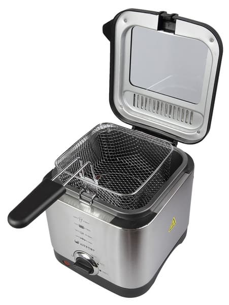 Фритюрница почти кубической формы со скругленными гранями удивляет своим размером — ее можно назвать миниатюрной. Конструкция аппарата чрезвычайно проста. Корпус изготовлен из нержавеющей стали и пластика черного цвета. Металл обработан хорошо, его поверхность гладкая, без зазубрин. Пластик выглядит стандартно для недорого материала китайского производства. На лицевой стороне фритюрницы нанесены подсказки по параметрам жарки некоторых продуктов. В нижней части находится терморегулятор, ниже и левее него — индикатор нагрева.