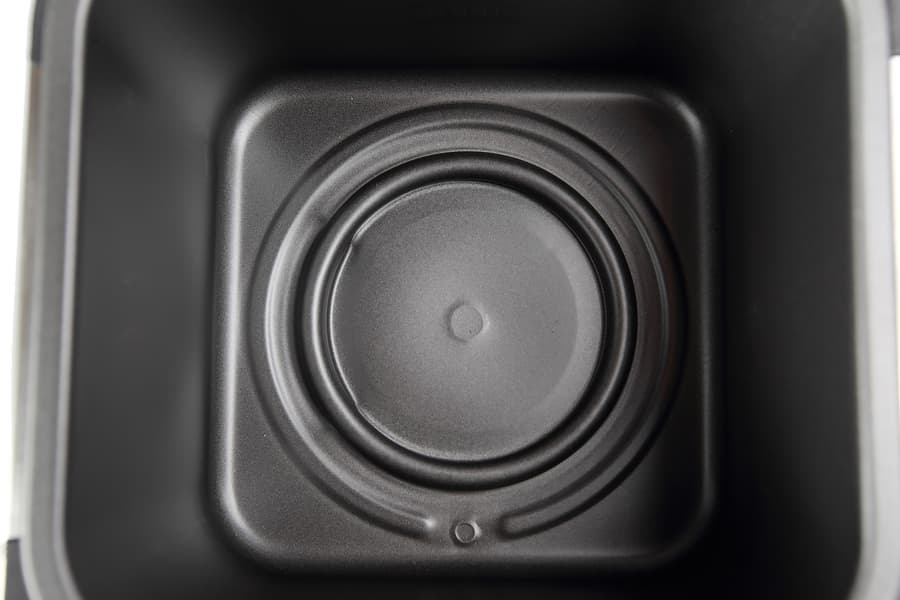 Поверхность масляной ванны обработана антипригарным покрытием. Конструкция чаши — несъемная. На краю левого дальнего угла виден небольшой вырез, облегчающий слив масла по завершении жарки. Стенки гладкие, на одной из них выбиты отметки минимального и максимального уровня масла. На дне угадывается место установки нагревательного элемента.