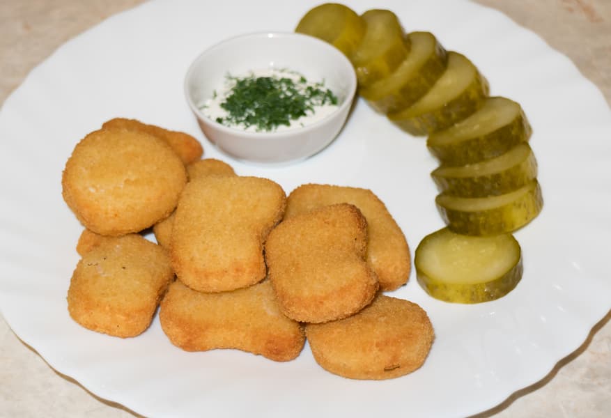 Курица внутри отлично прожарилась, корочка плотная и хрустящая. К готовым наггетсам отлично подошел соус на основе сметаны с добавлением соли, давленого чеснока и укропа.