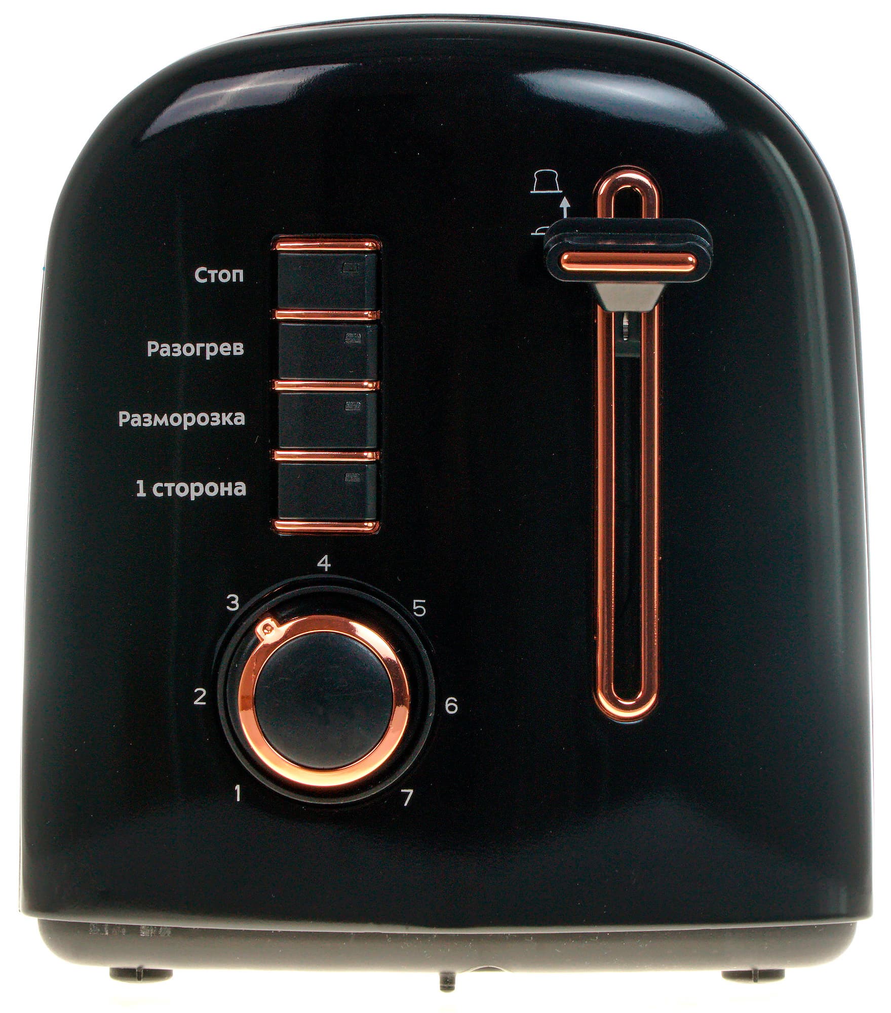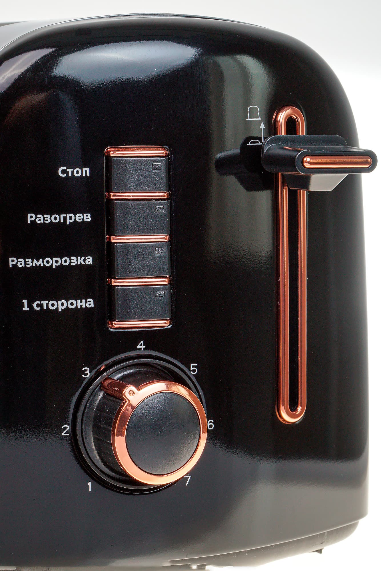 На второй торцевой стенке расположен центр управления тостером. Это широкие и невысокие кнопки со светодиодной подсветкой и круглый регулятор степени прожарки. Также там есть и рычаг для опускания ломтей хлеба. Все элементы сделаны из черного пластика и отделаны медным кантом: выглядит красиво, но, на взгляд автора обзора, как-то не очень гармонично сочетается с зеркальным металлом широких сторон.