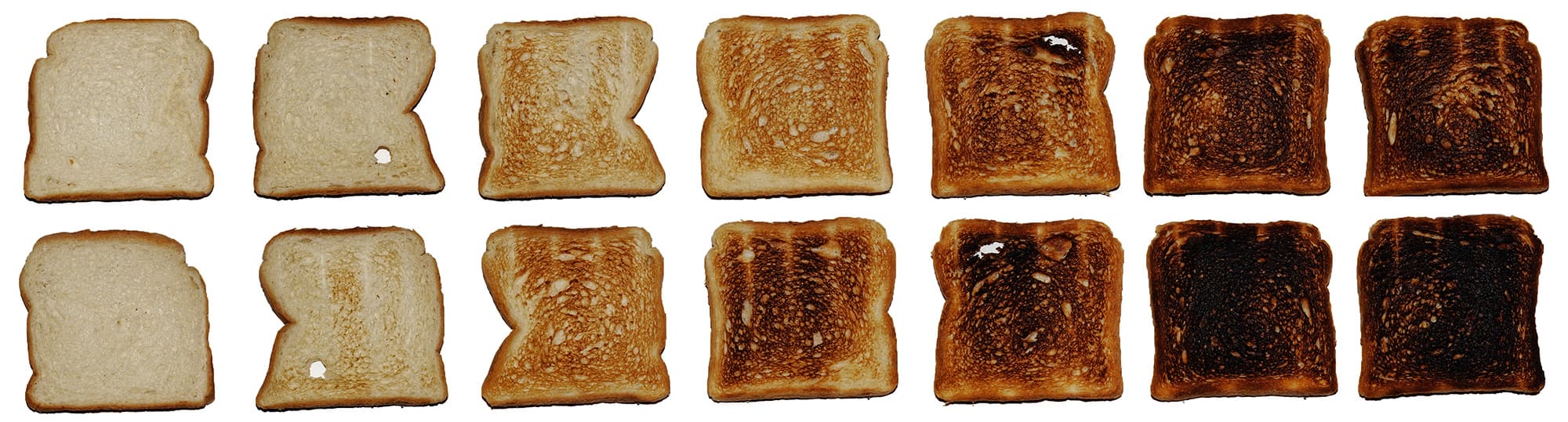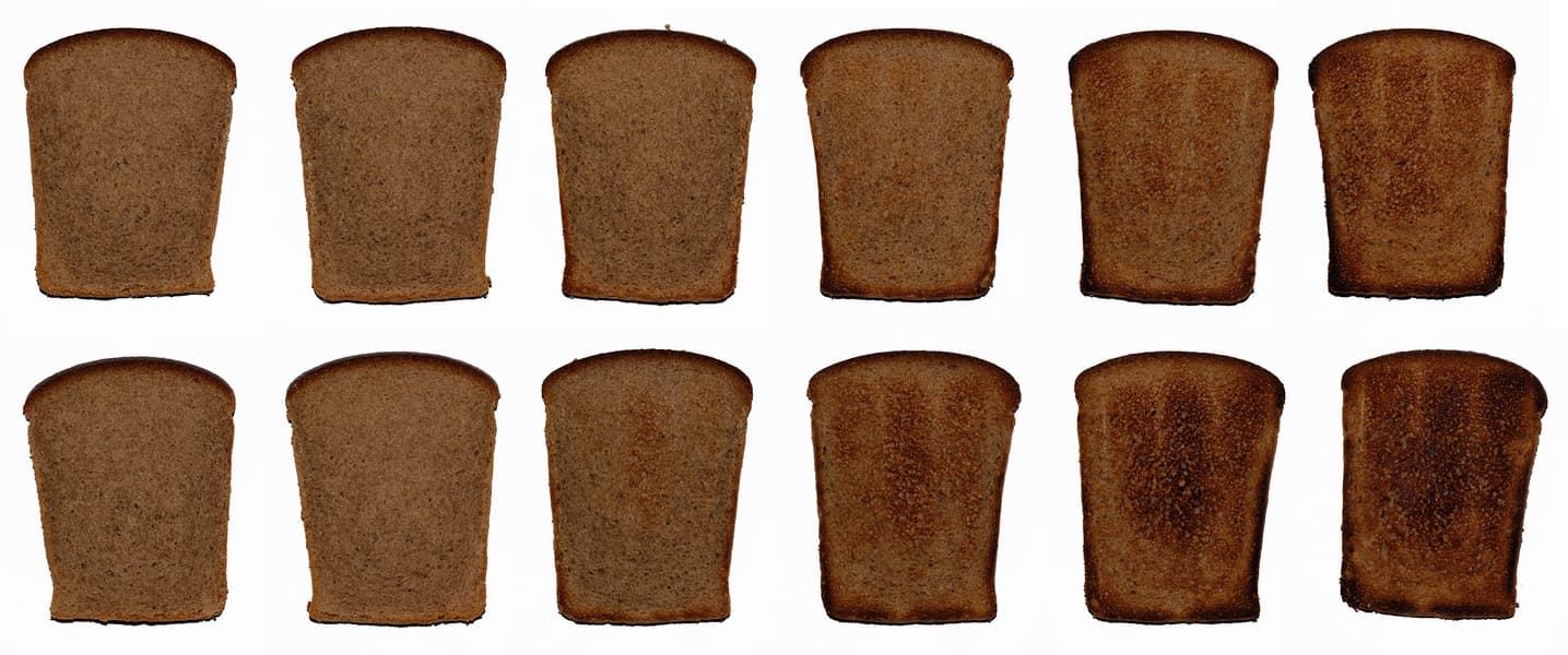На фотографии видно, как изменяется цвет корочки тостового хлеба в зависимости от степени прожарки.