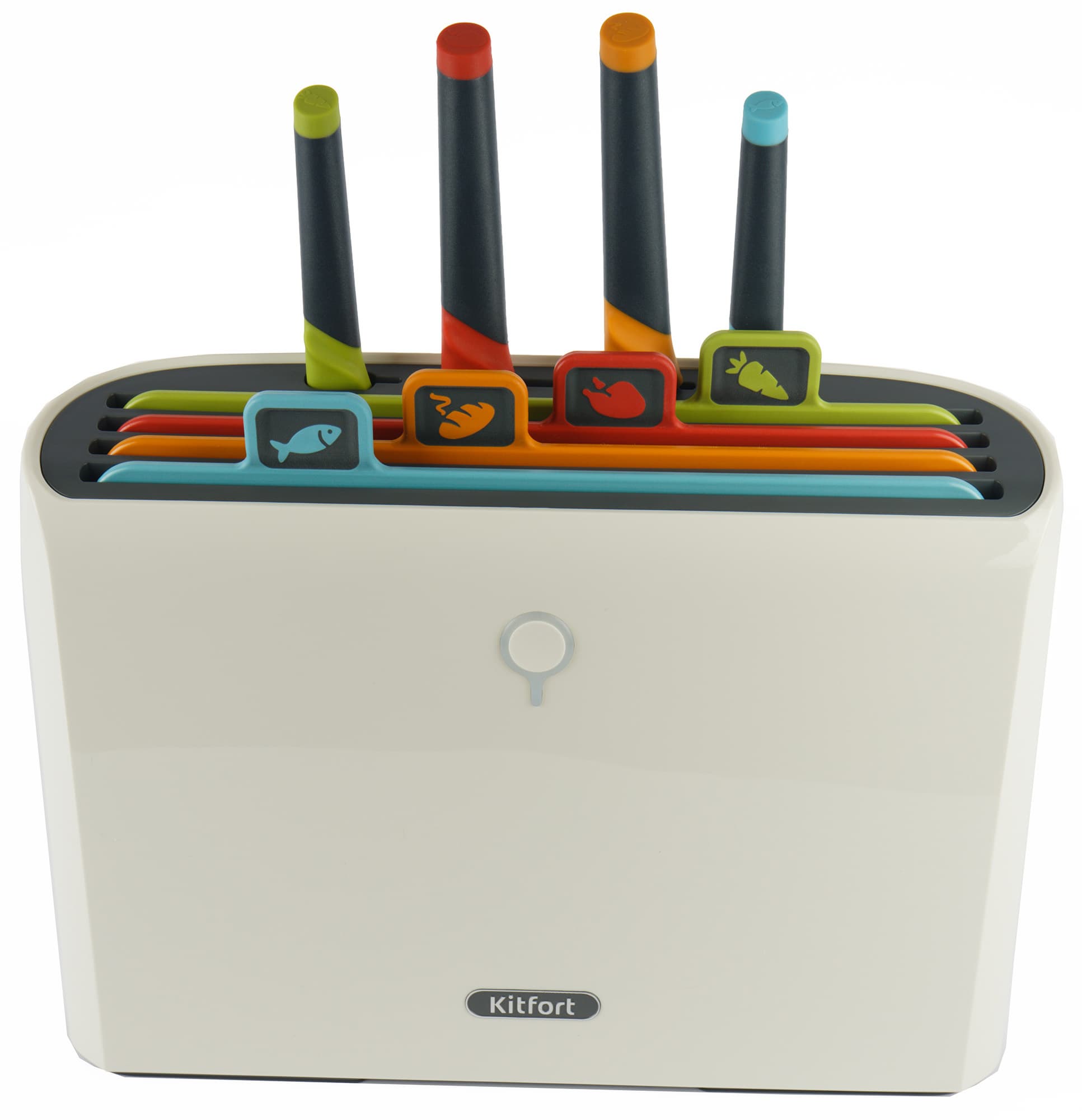 На фоне повышенного внимания к здоровью в целом и микроорганизмам в частности появление такого прибора, как стерилизатор для ножей и досок, вполне закономерно. Раз люди веками питаются термически обработанными мясом и рыбой, логично не оставлять частицы сырых продуктов на кухне. Отдельными досками для разных типов пищи уже никого не удивишь, тем более что большой семье их в любом случае требуется несколько. Разные формы ножей, приспособленные для разных кулинарных задач, тоже стали неотъемлемой частью современной кухни. Так что компания Kitfort не совершила революцию и не выдумала ненужный прибор, а разумно соединила потребности в чистых досках и ножах. Так появился стерилизатор Kitfort KT-2051 с комплектом из четырех ножей и досок для разных продуктов.