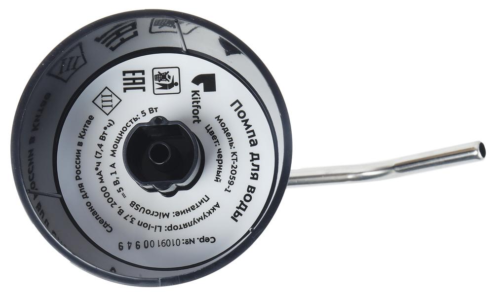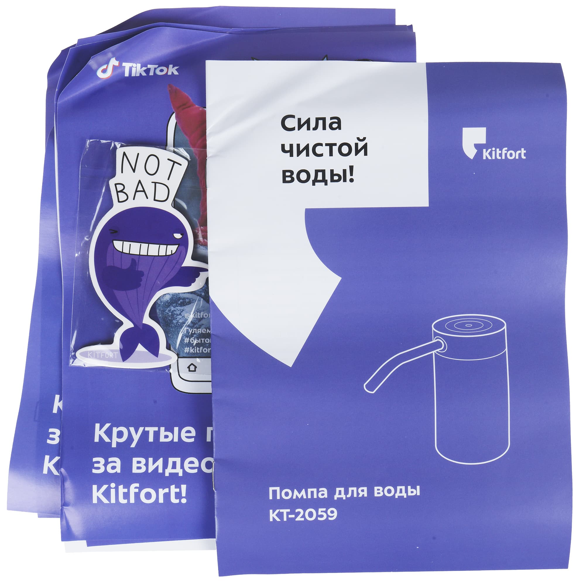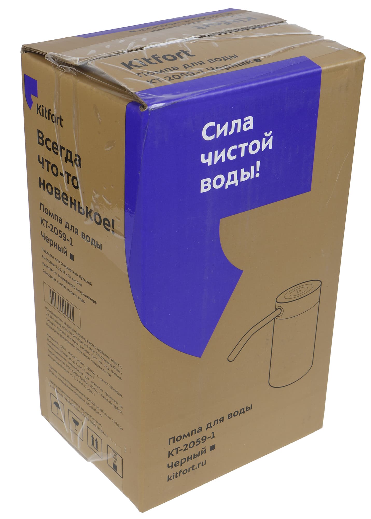 Помпа KT-2059 упакована в коричневую картонную коробку с двухцветной печатью, оформленную в фирменном стиле Kitfort: на лицевой стороне изображено устройство, скрывающееся за стенками. А над рисунком в синем логотипе компании размещен слоган... Читатели хором: «Свой для каждого типа устройств этого производителя». Но вы ни за что бы не догадались, насколько креативны маркетологи оказались на этот раз: «Сила чистой воды!»