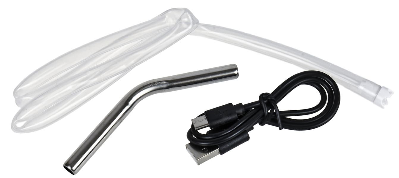 На задней стороне помпы есть разъем Micro-USB для зарядки. К нему подсоединяется полуметровый кабель с разъемом USB Type-A, идущий в комплекте. Зарядного устройства в коробке нет: пользователь может использовать любой 5-вольтовый источник питания с силой тока до 1 А.