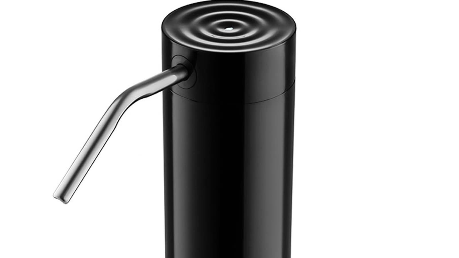 Верхняя поверхность цилиндра украшена концентрическими кругами, имитирующими волны: удачное решение для водяного насоса. В центре крышки располагается индикатор в виде капли, совмещенный с сенсором управления. При нажатии на последний устройство начинает работать, а индикатор подсвечивается белым светодиодом.