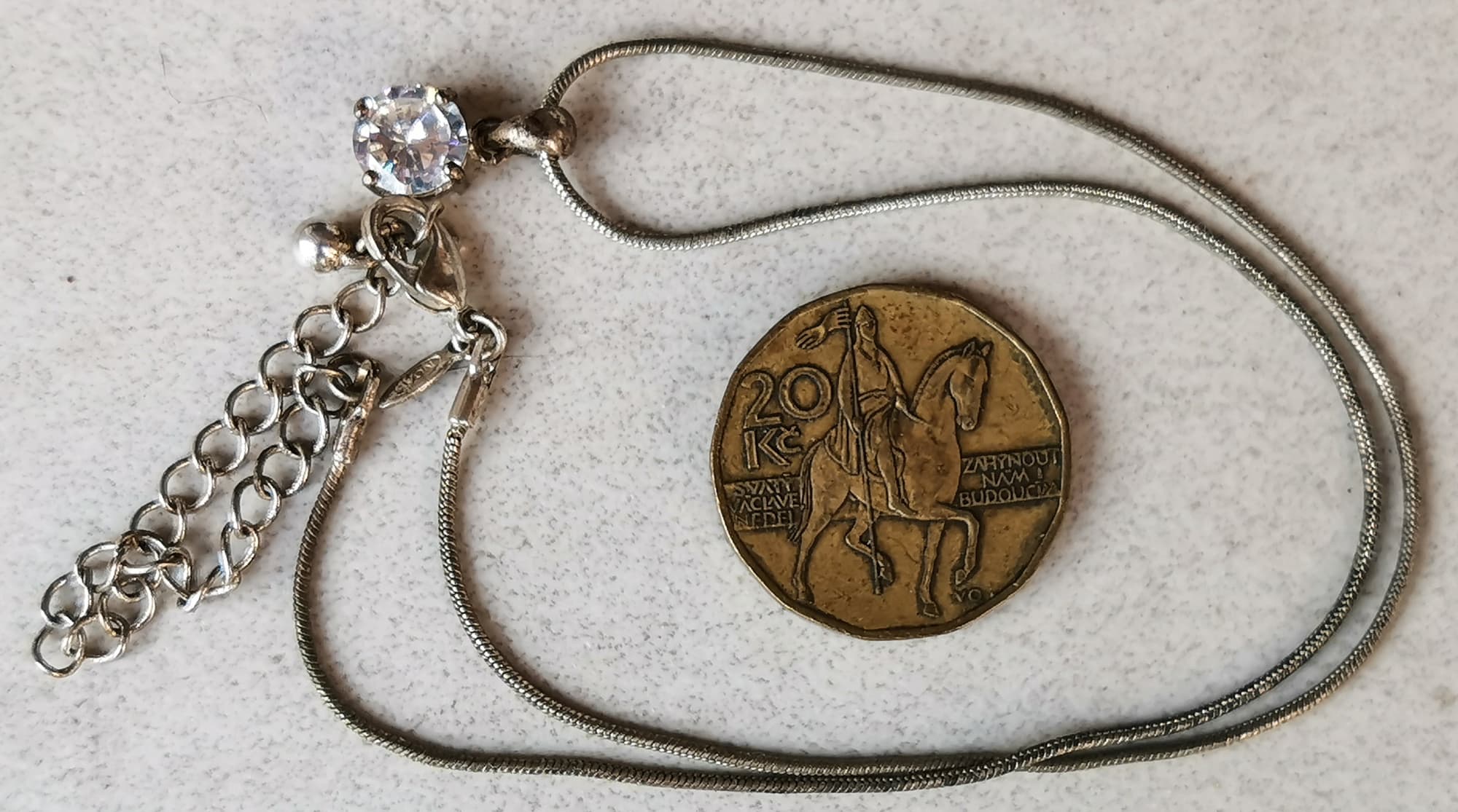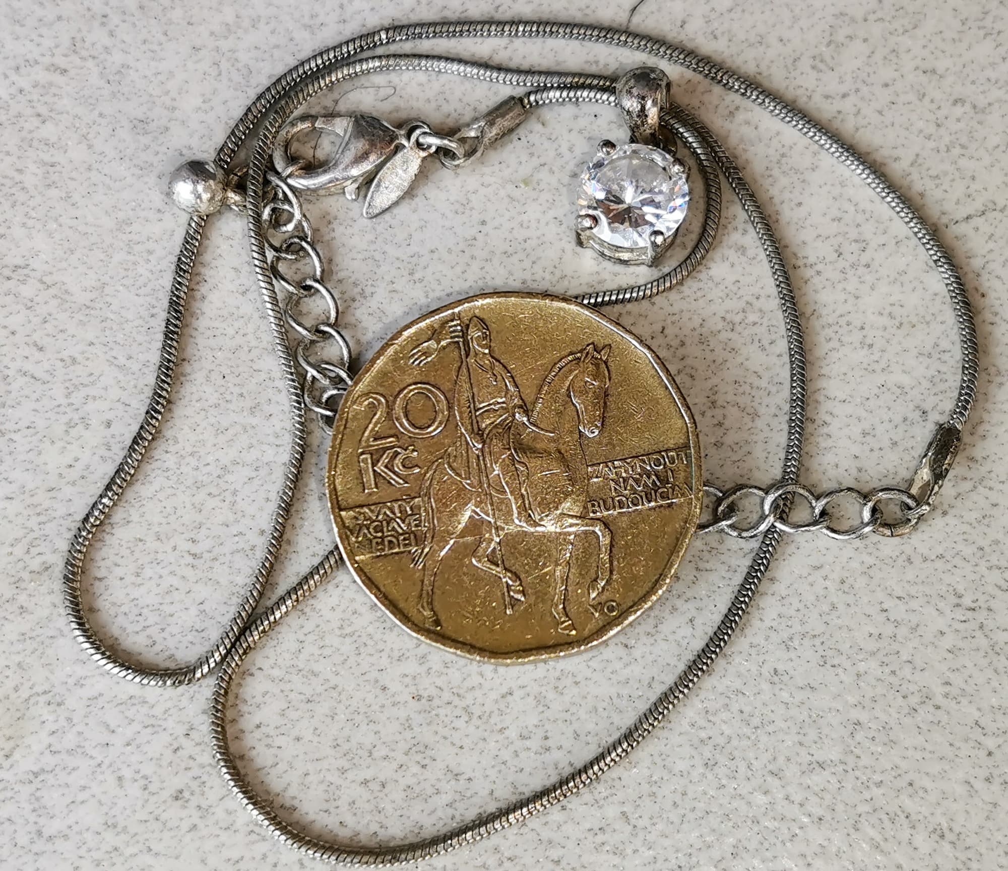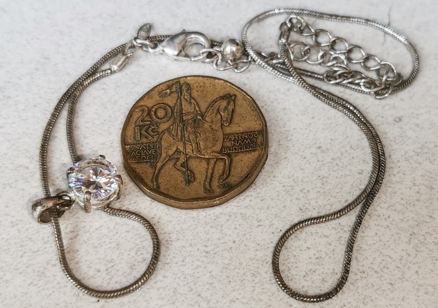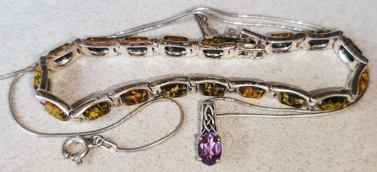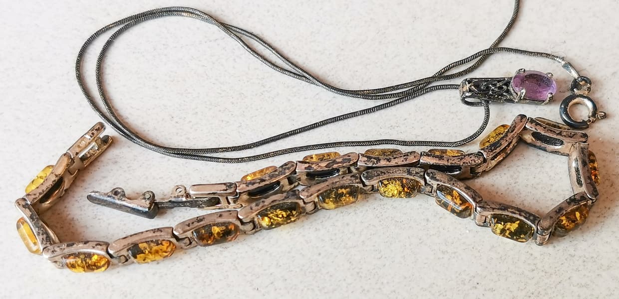 Для тестов мы нашли серебряный браслет с янтарными вставками, лет 10 пролежавший в ящике комода, пару старых серебряных цепочек и монету.