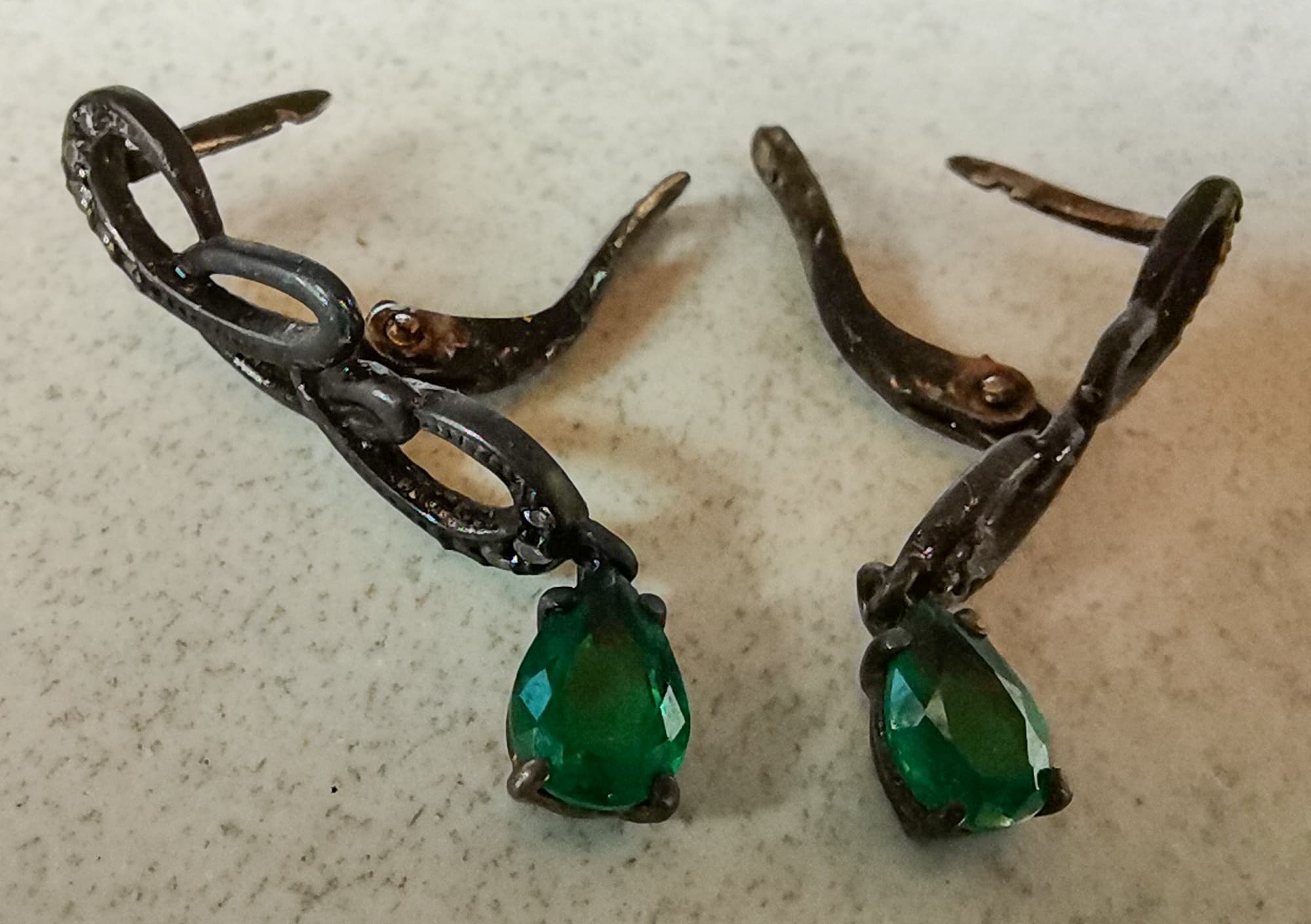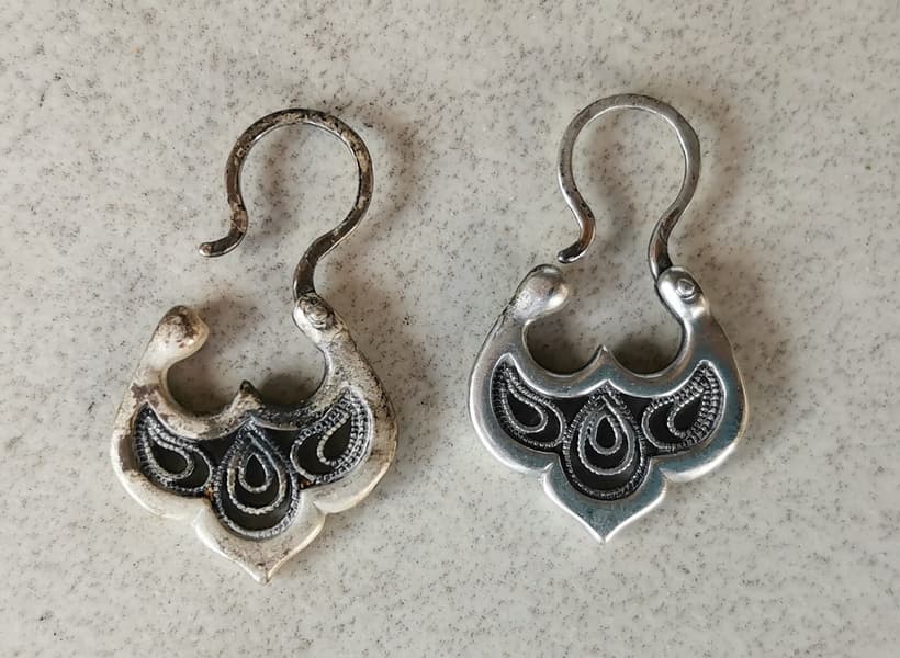 Для того чтобы понять разницу между чисткой только порошком и чисткой с помощью мойки с доведением при помощи порошка, мы взяли очередную пару старых серебряных и очень грязных сережек.