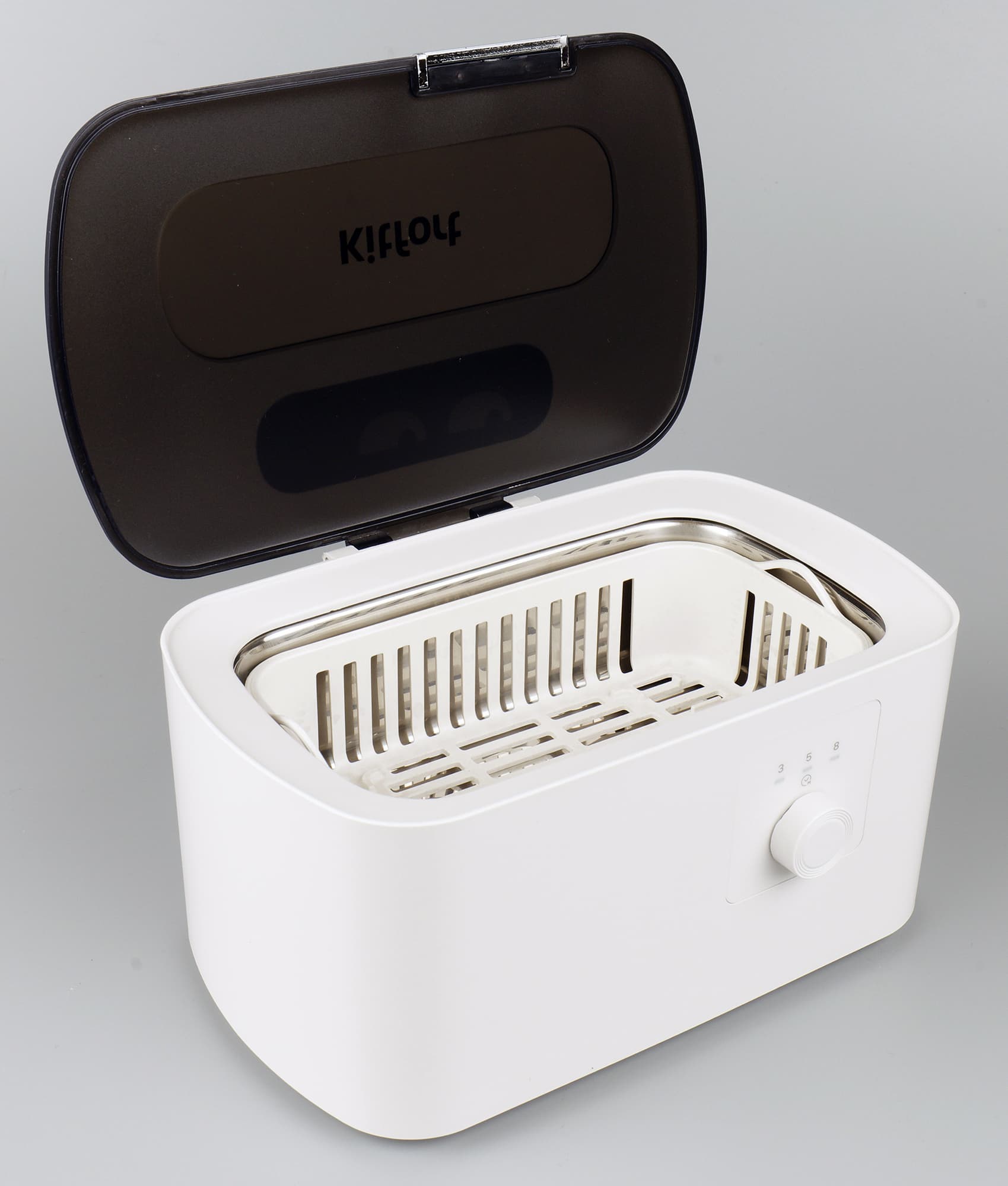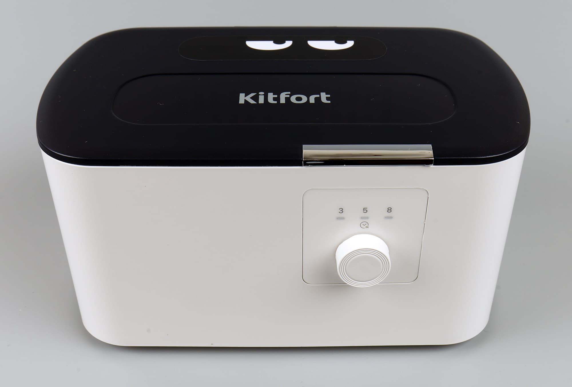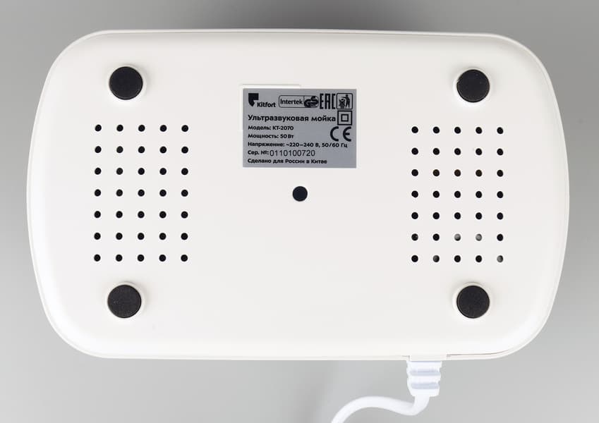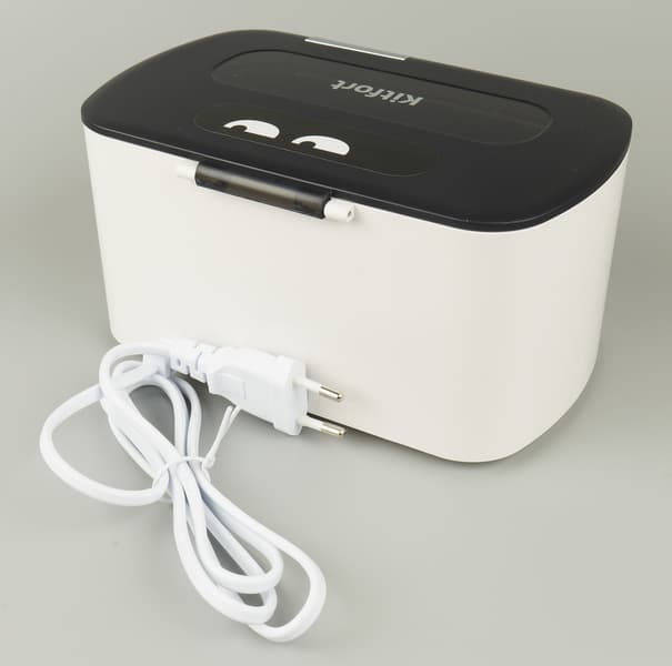 Начнем с мойки КТ-2070. Это небольшой прямоугольный бокс со скругленными углами. Цвет корпуса белый, простая пластиковая крышка — черная. Внутри корпуса встроена ванночка из нержавеющей стали, вмещающая 500 мл жидкости. Спереди корпуса — кнопка включения, являющаяся также ручкой регулировки времени.