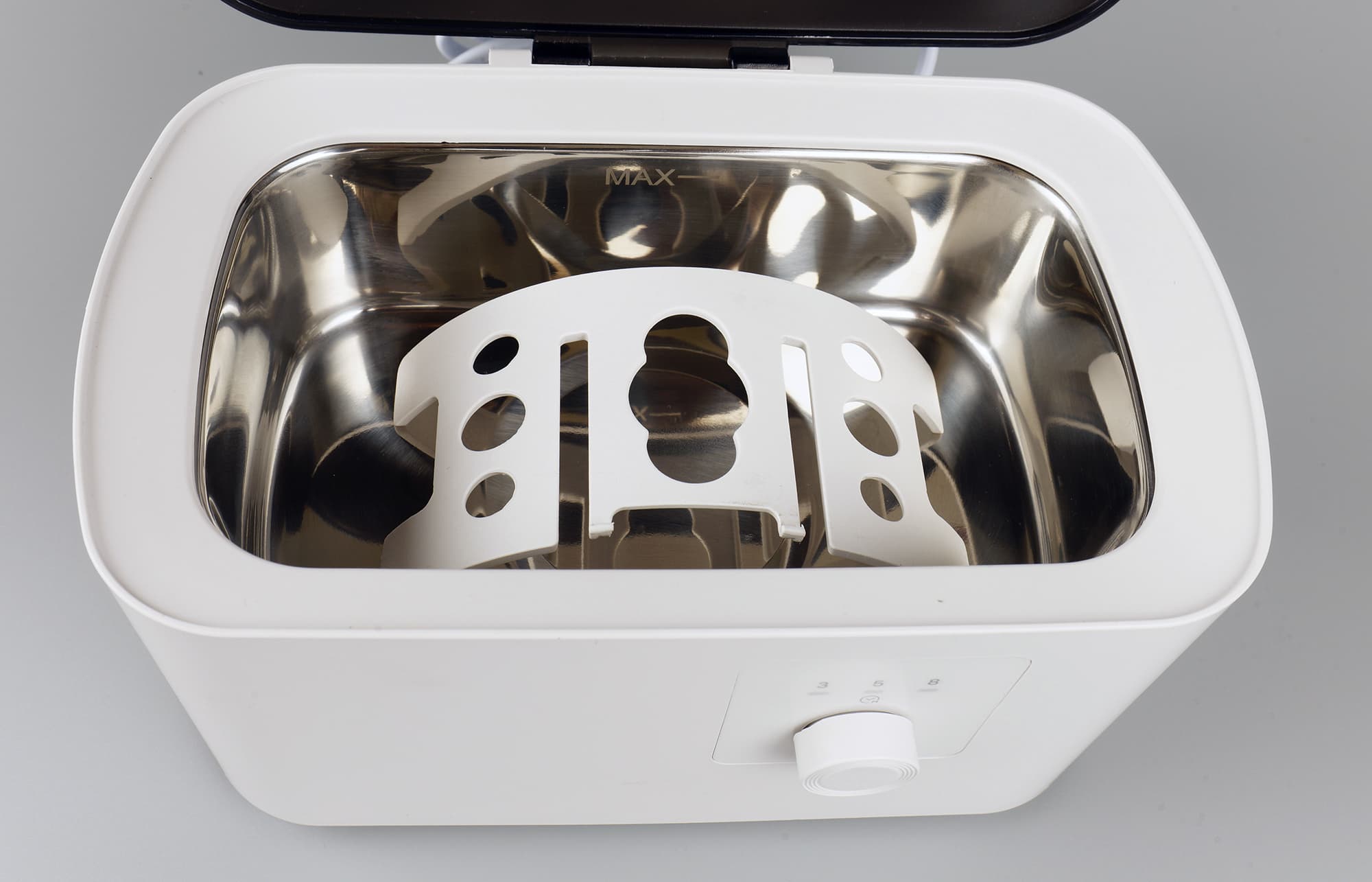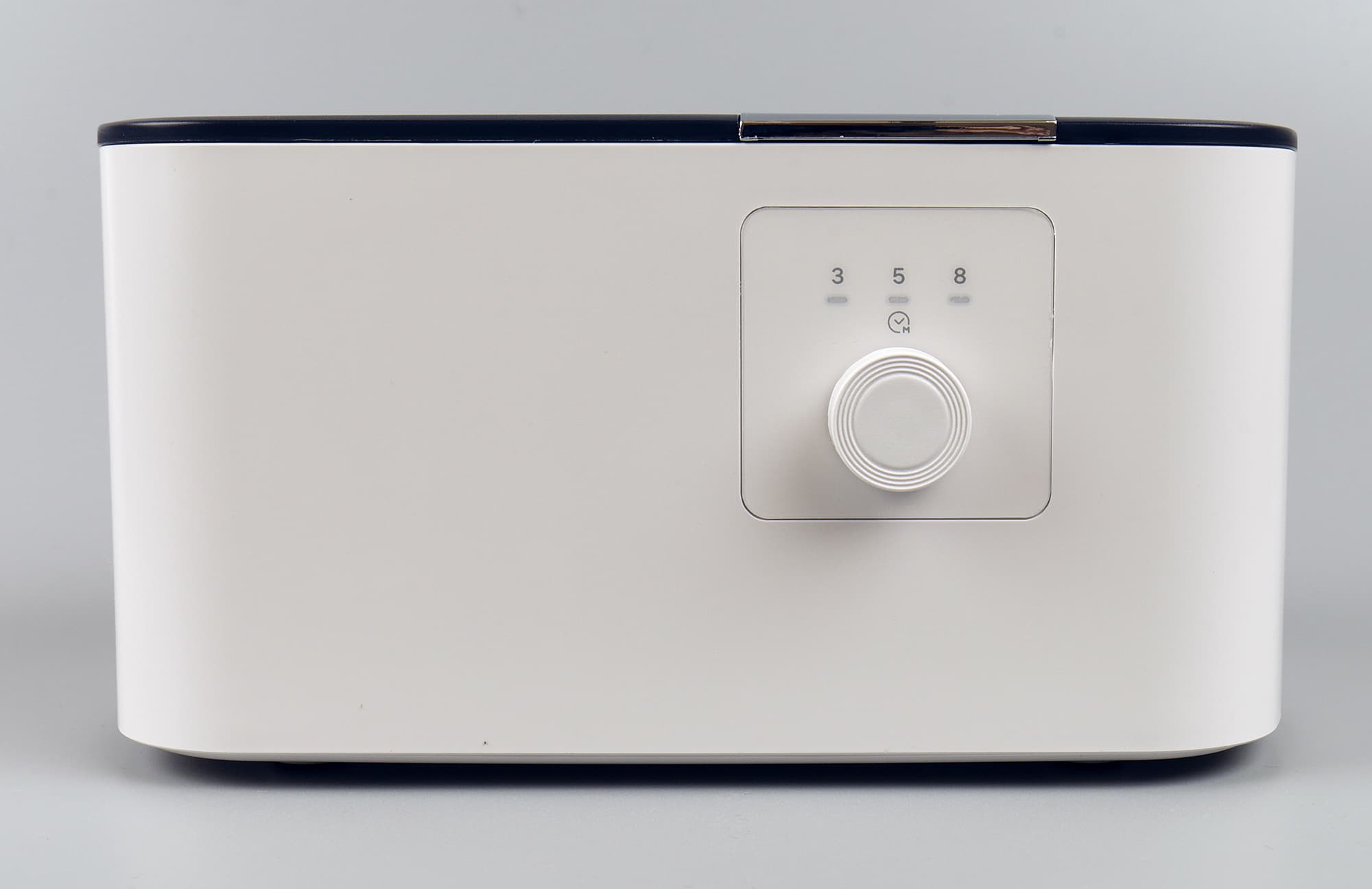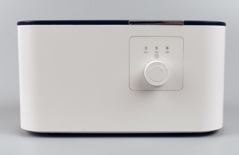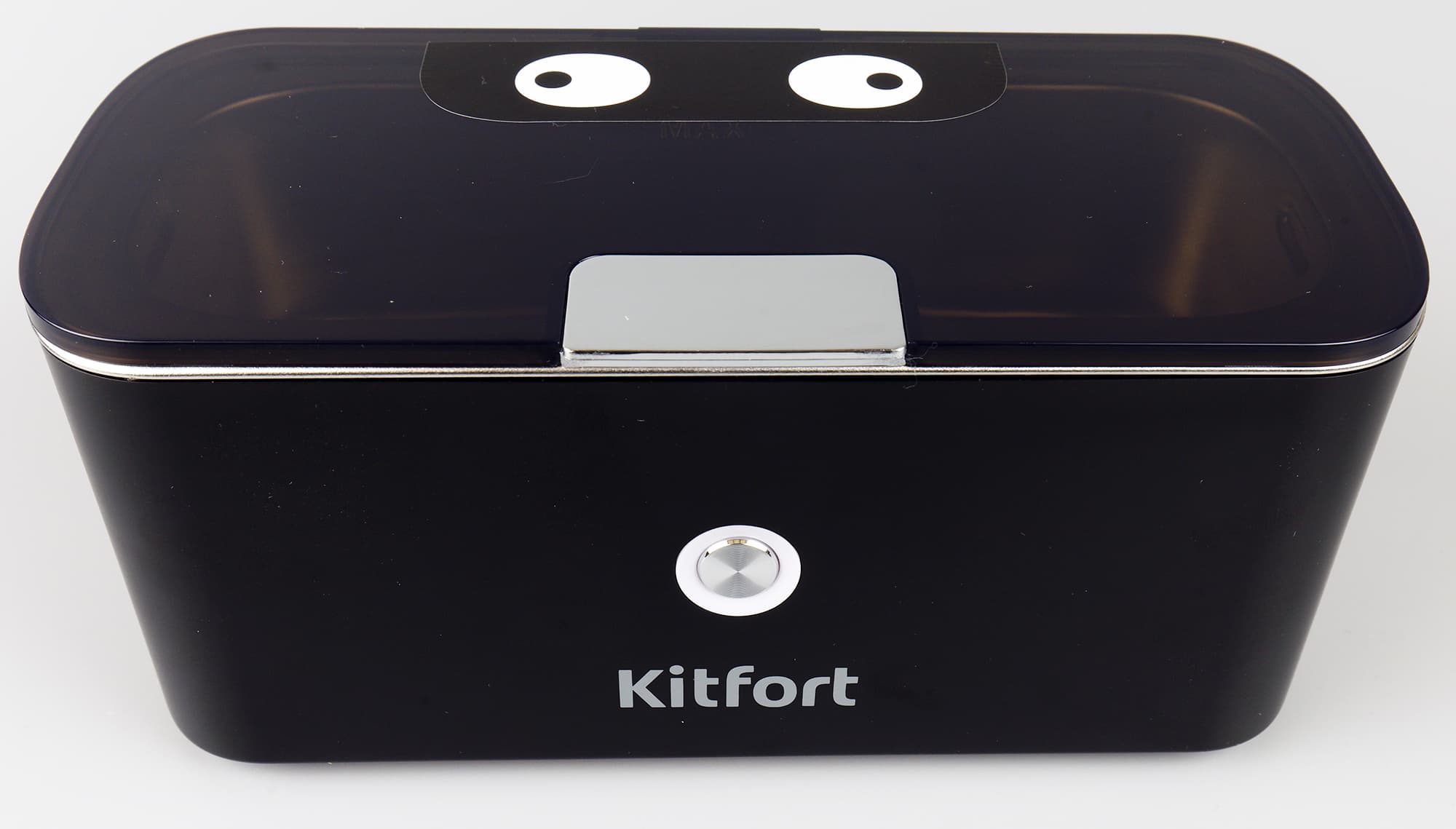 Начнем с мойки КТ-2070. Это небольшой прямоугольный бокс со скругленными углами. Цвет корпуса белый, простая пластиковая крышка — черная. Внутри корпуса встроена ванночка из нержавеющей стали, вмещающая 500 мл жидкости. Спереди корпуса — кнопка включения, являющаяся также ручкой регулировки времени.