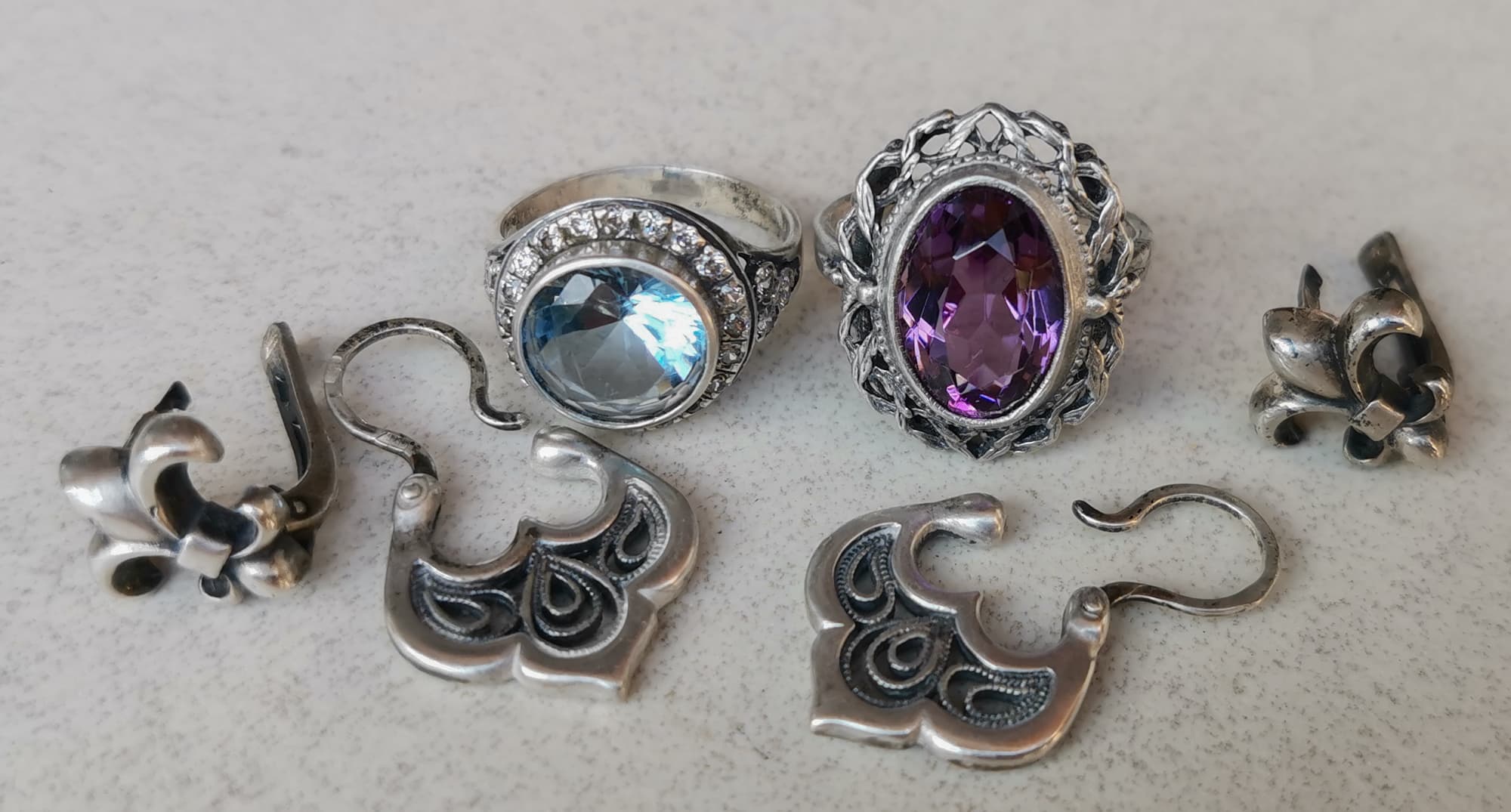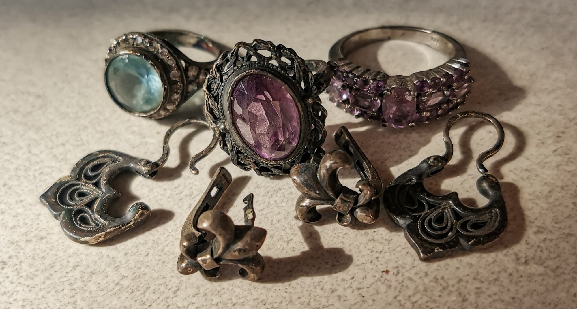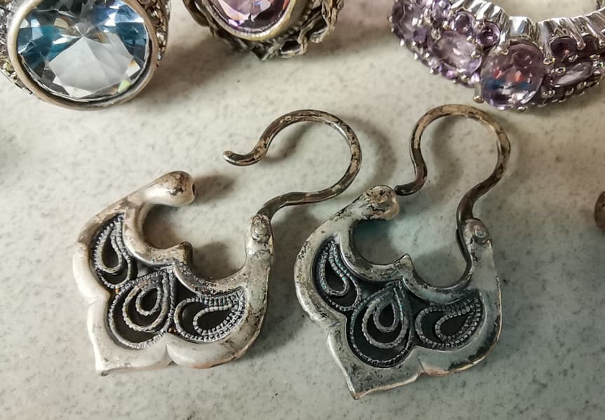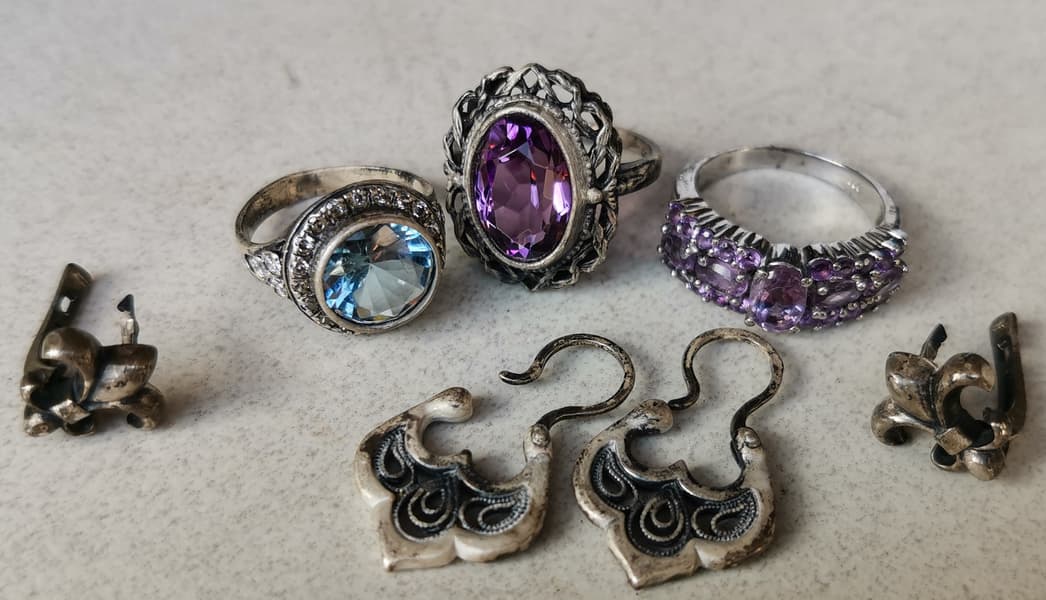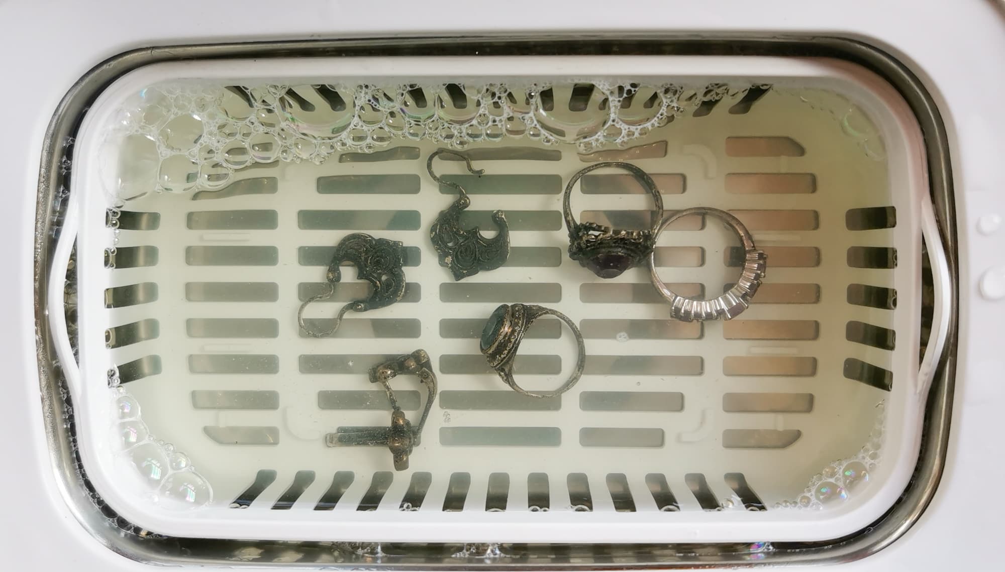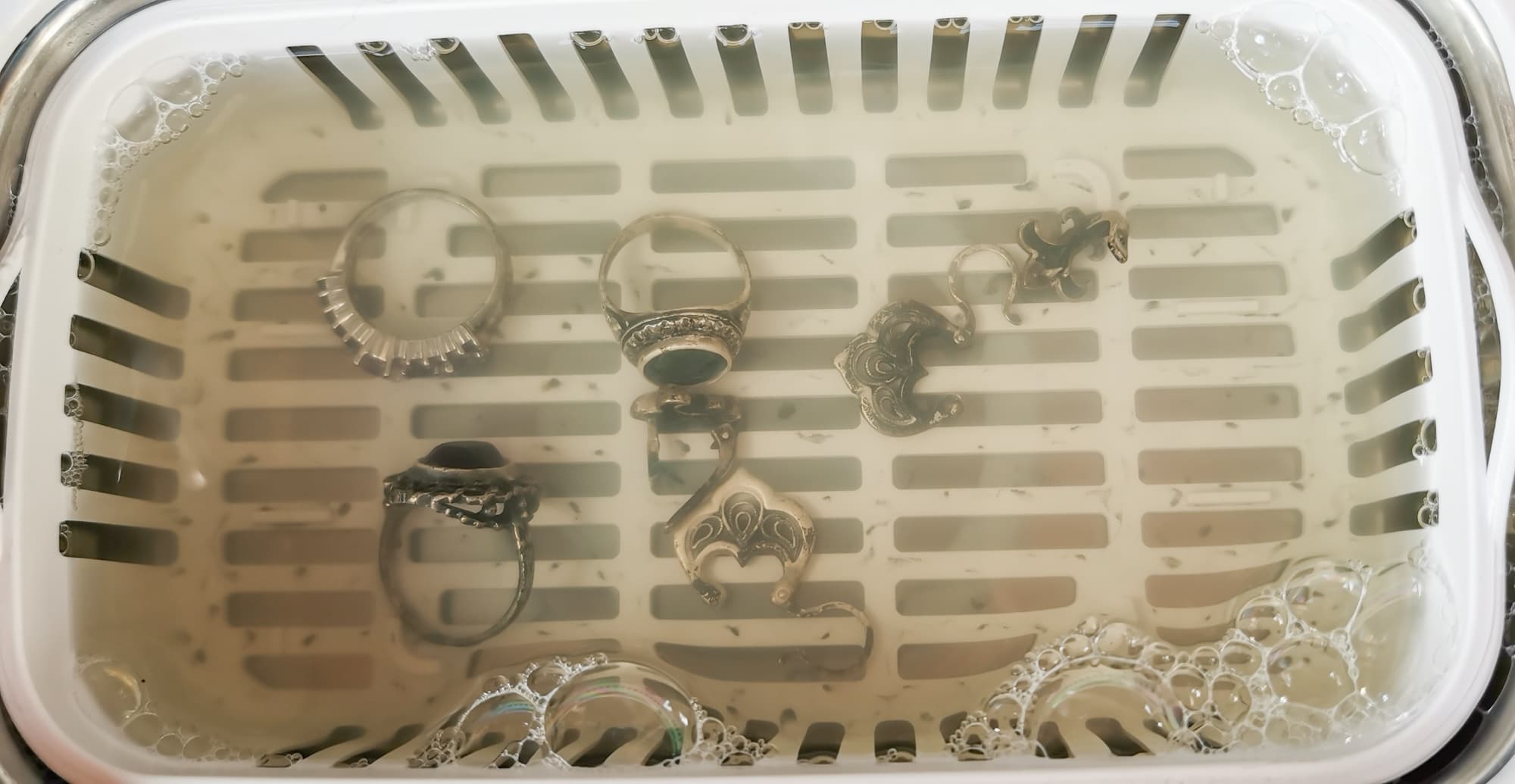 Для понимания, насколько мойка хорошо справляется с очисткой ювелирных изделий, мы решили отмыть в ней старые серебряные украшения. Кольца с натуральными камнями, серебряную филигрань и гладкое серебро.