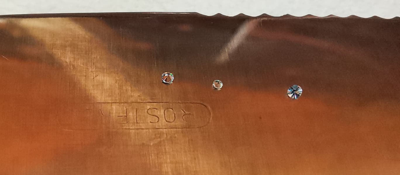 На фото нож после ультразвуковой мойки посередине, справа нож почищенный порошком, слева образец для сравнения.