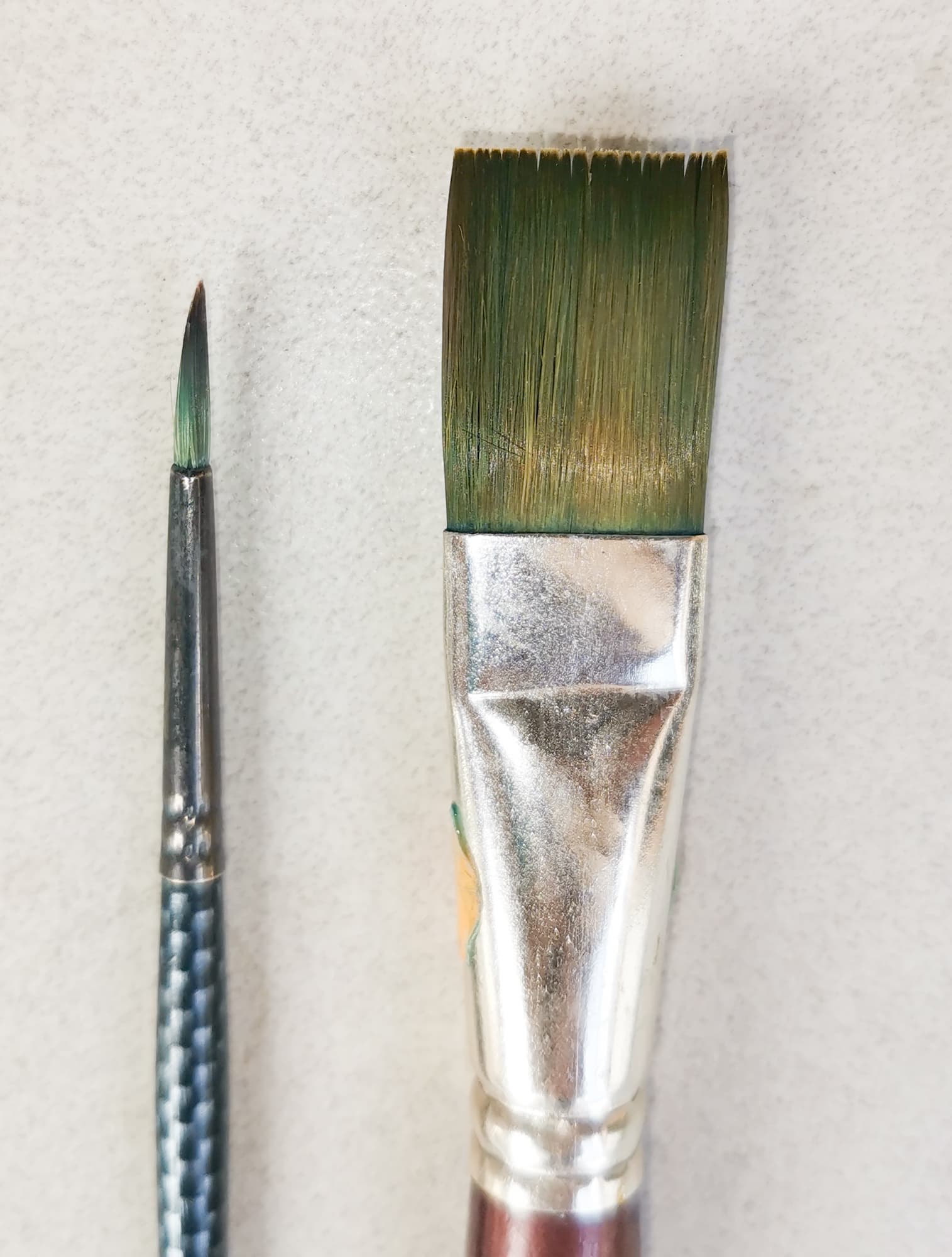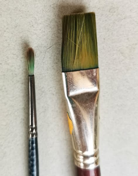Эти кисточки использовались для рисования темперной краской, в состав которой входит ПВА, поэтому вычистить ворс у основания всегда трудно, особенно когда кисточка не домывается вовремя. К тому же, данные кисти пролежали в ящике больше года и остатки краски на них совсем засохли.