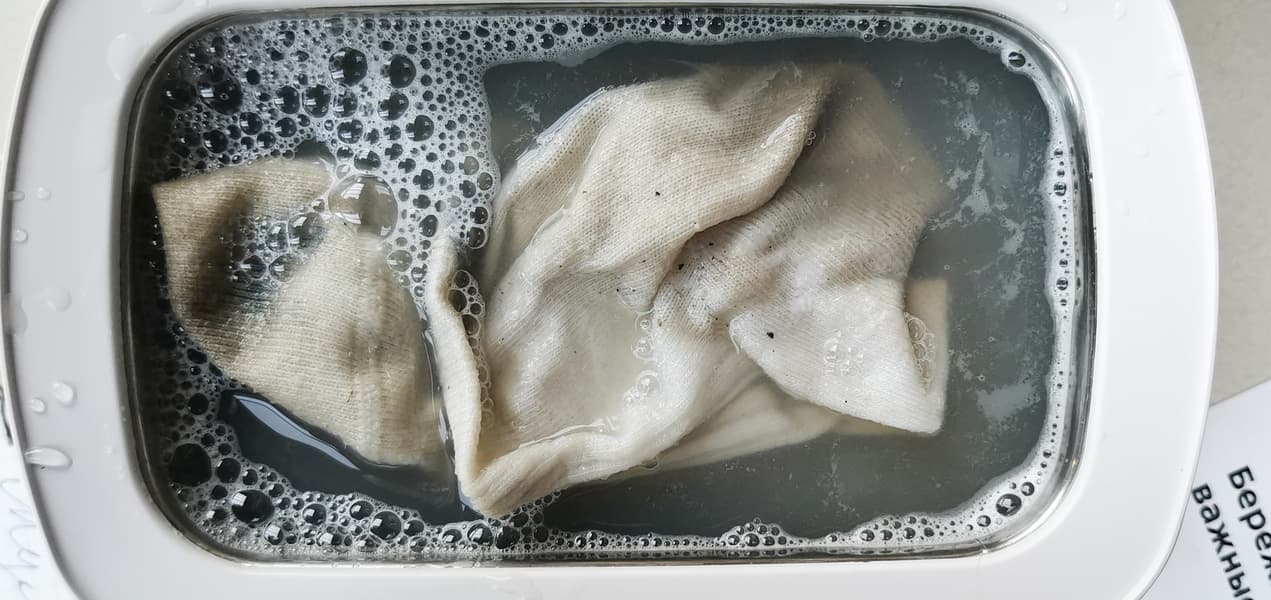 Носок пробыл в ванночке два цикла по 5 минут, после чего был извлечен. В сыром изменения были не особо заметны.