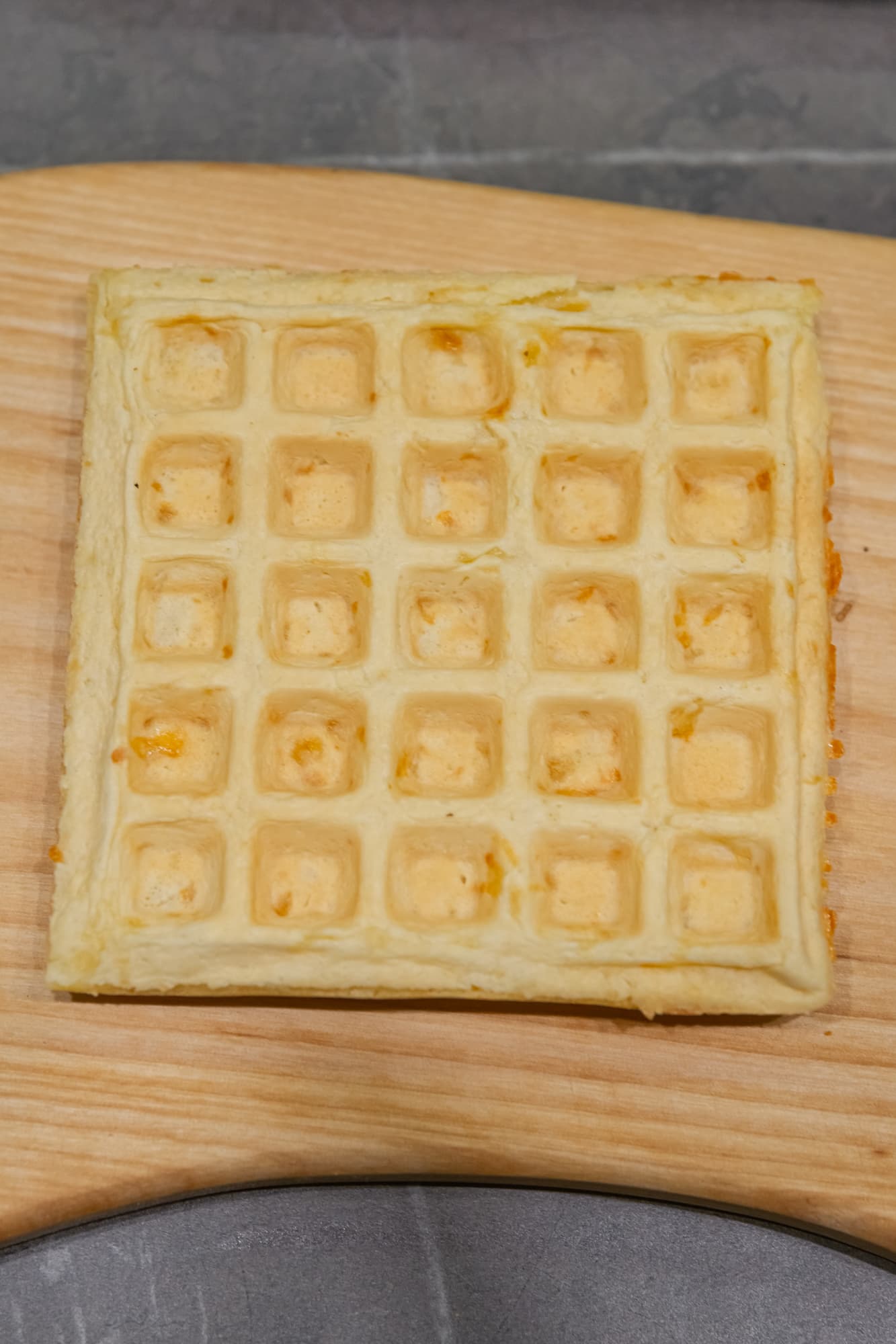 Смешали в миске 2 яйца и 50 мл молока. Потом туда же добавили щепотку соли, чайную ложку разрыхлителя и взбили венчиком до однородности и легких пузырьков. Добавили 100 г просеянной муки, 20 мл подсолнечного масла и еще раз хорошенько всё перемешали. Следом засыпали в емкость тертый сыр и снова перемешали. Разогретые панели смазали растительным маслом и выложили примерно две столовые ложки теста.