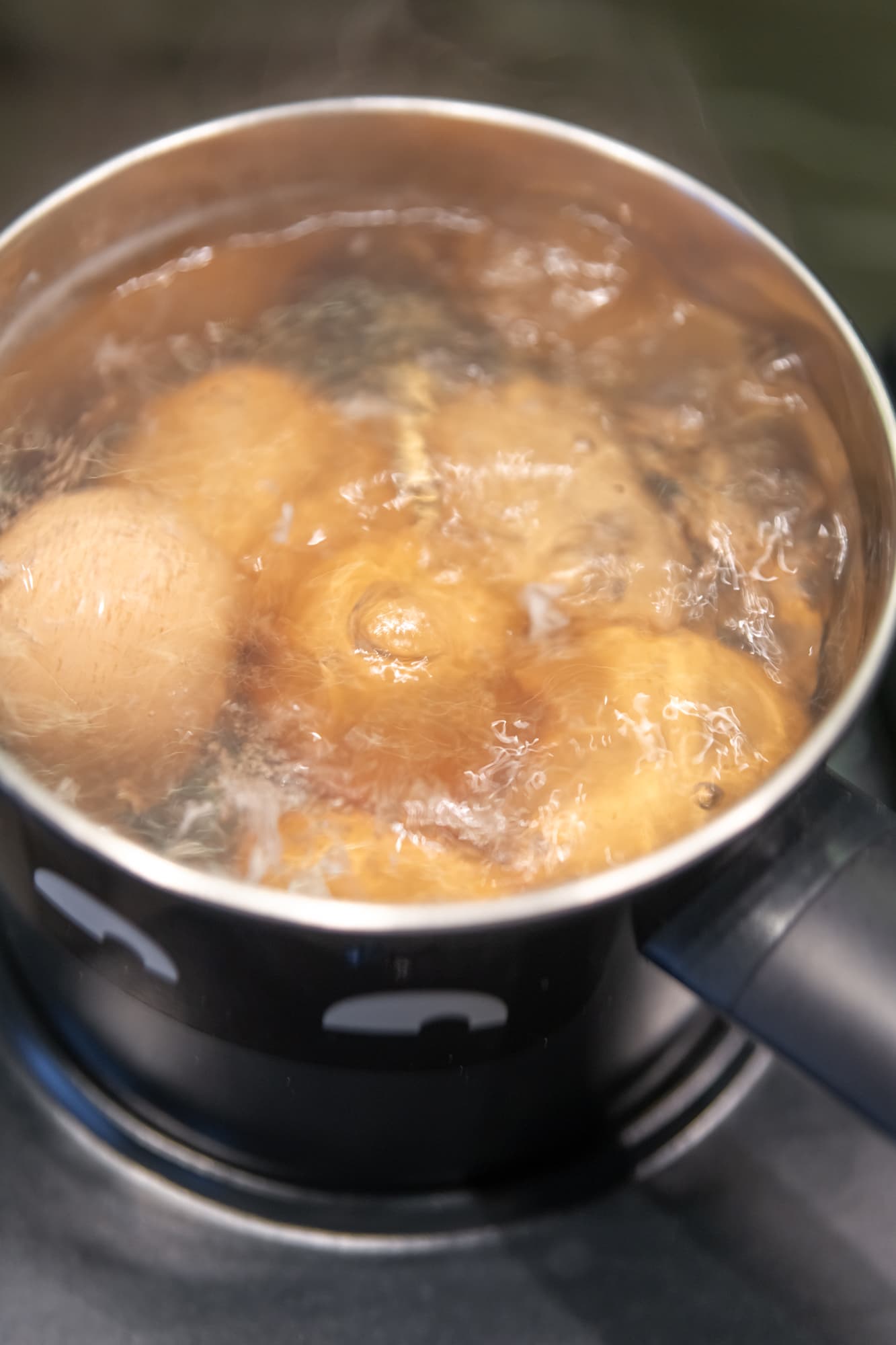 Начали мы с конфорки. Чуть меньше литра воды закипело примерно через 8 минут. В один слой поместилось 6 средних яиц. Конфорка работала на максимуме. Вкрутую яйца сварились за 13 минут.
