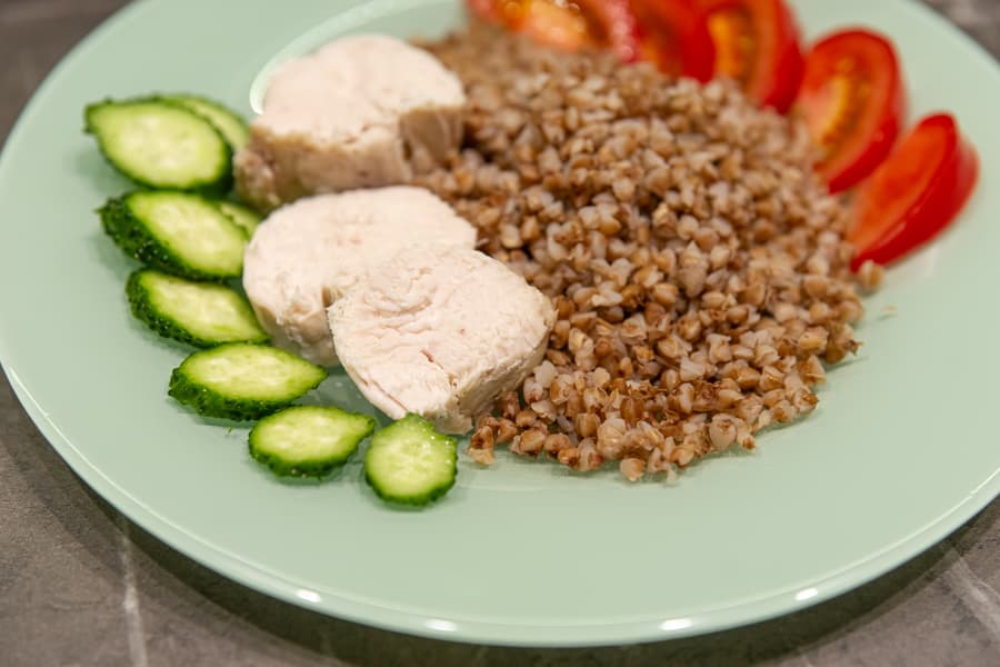 Поместили в кастрюлю 250 г промытой гречневой крупы, залили холодной водой 1:2, посолили и поставили закипать, повернув ручку регулятора на максимум. Сверху поставили пароварку с разрезанным на две части куском куриного филе общим весом 350 г и накрыли крышкой.