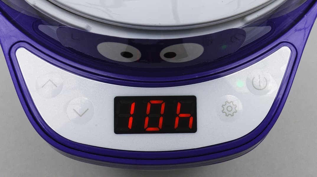 Установки времени соответствуют паспортным с точностью до нескольких секунд: таймер у йогуртницы весьма точен. А вот температура приготовляемых молочных продуктов оказалась на два-три градуса выше. Для простых йогурта или сметаны это не слишком критично. А вот выбирая ручной режим для некоторых нежных и капризных заквасок, особенность устройства следует учитывать и ставить температуру с поправкой. Напомним, что если закрыть стакан белой пластиковой крышкой, а не прозрачной, внутри будет еще на 2-3 градуса жарче.