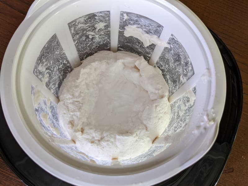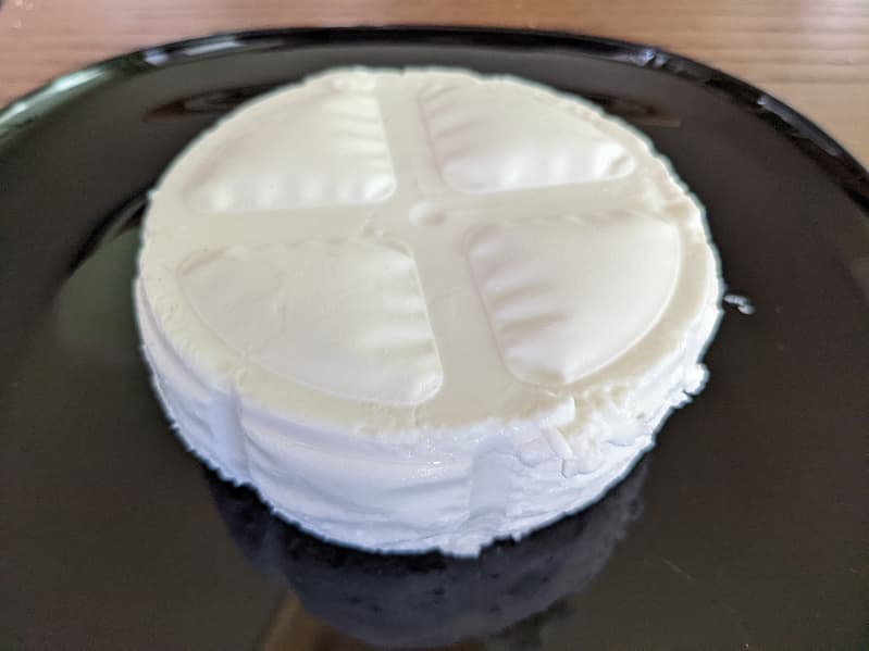 Из сита мы извлекли лепешку скорее даже не йогурта, а творога или творожного сыра толщиной около 4 см. Ее фактура оказалась нежной, но достаточно плотной. Она хорошо держит форму, ее можно резать ножом на кубики.