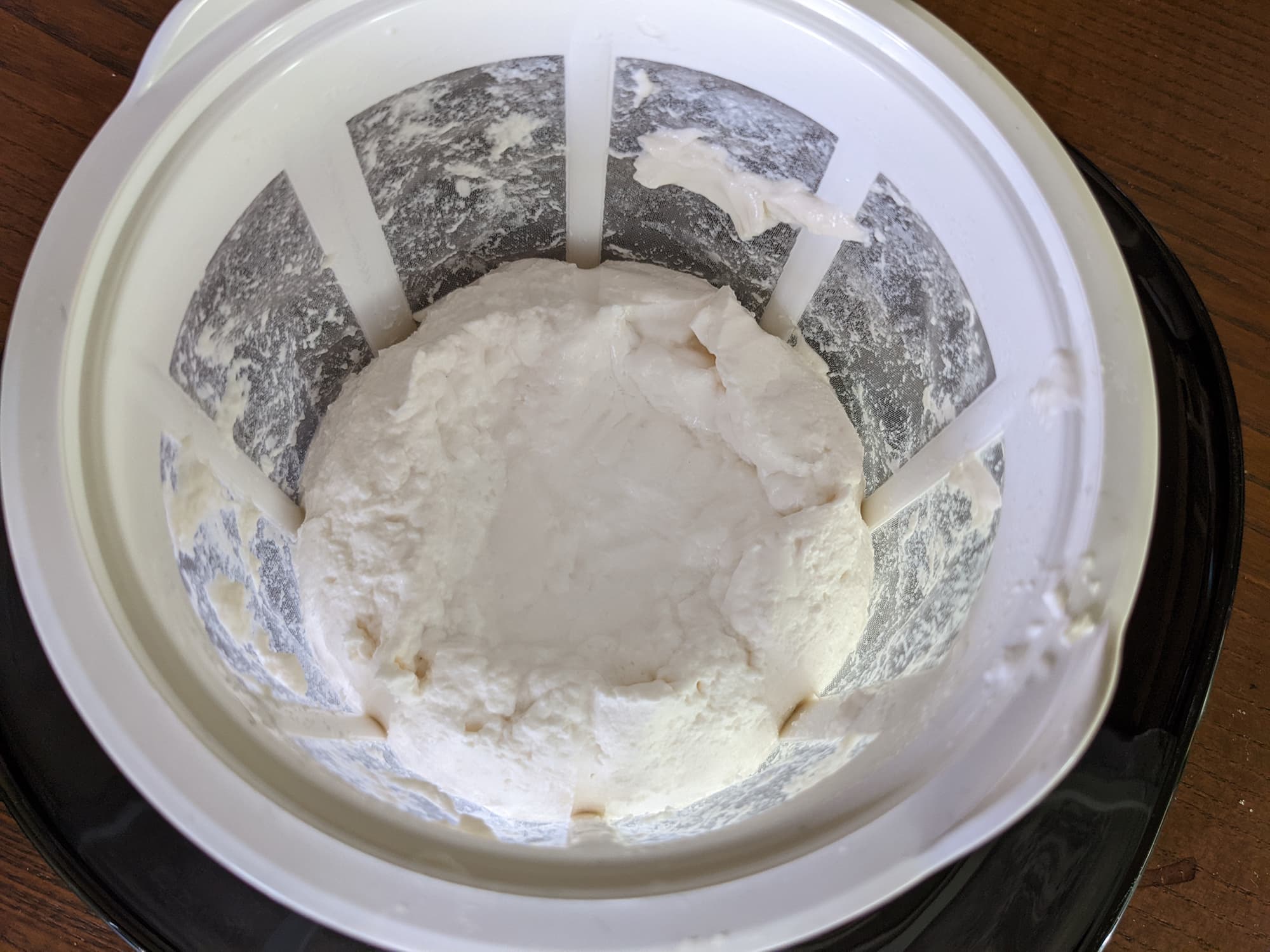 Чтобы получить из обычного йогурта греческий, мы выложили его в сито из комплекта, поставили стекать в стакан и убрали в холодильник. Вообще в рецепте написано, что для этого достаточно нескольких часов, но мы хотели получить более плотный продукт и оставили на сутки. Йогурт за это время существенно уменьшился в объеме.