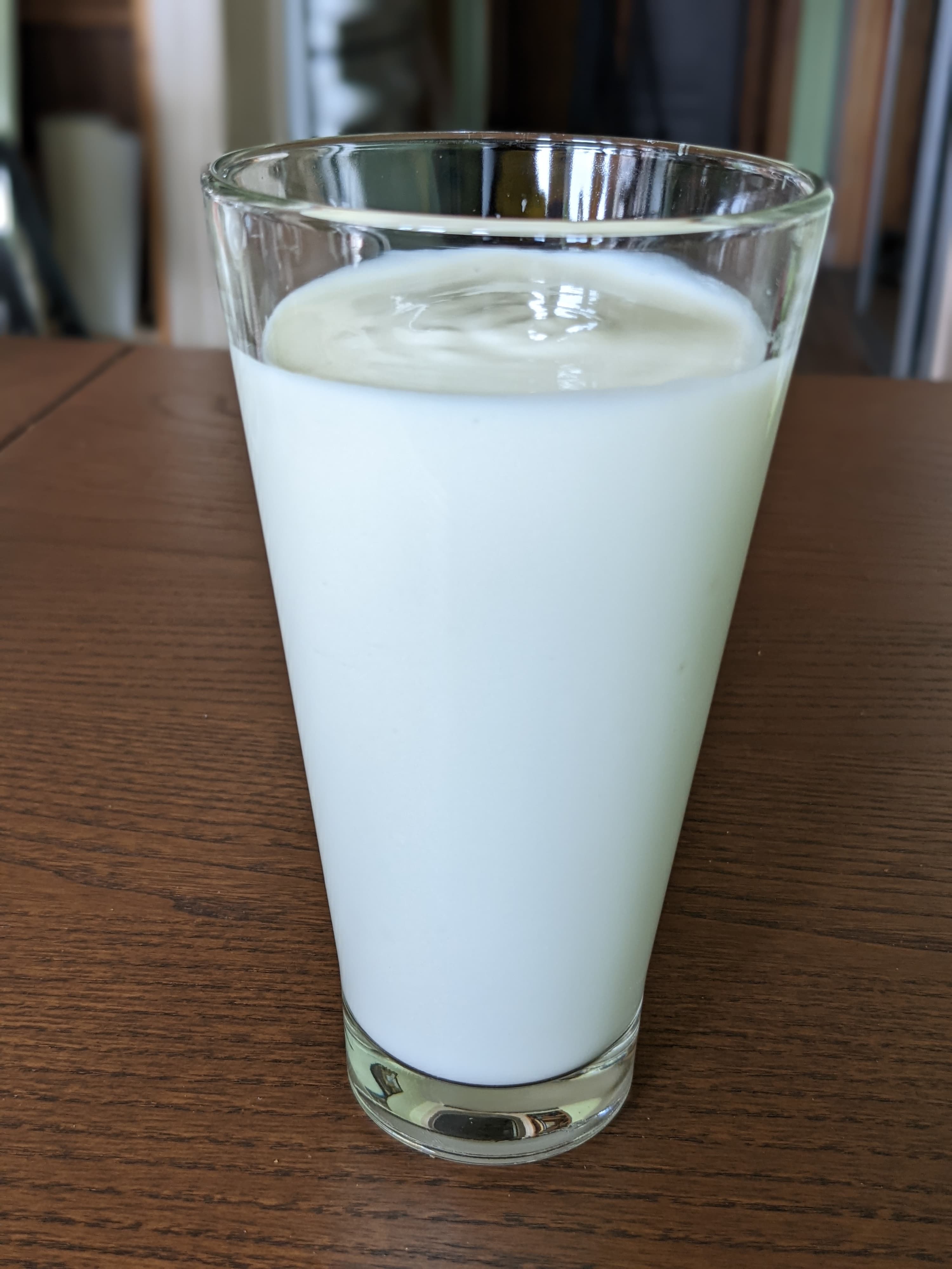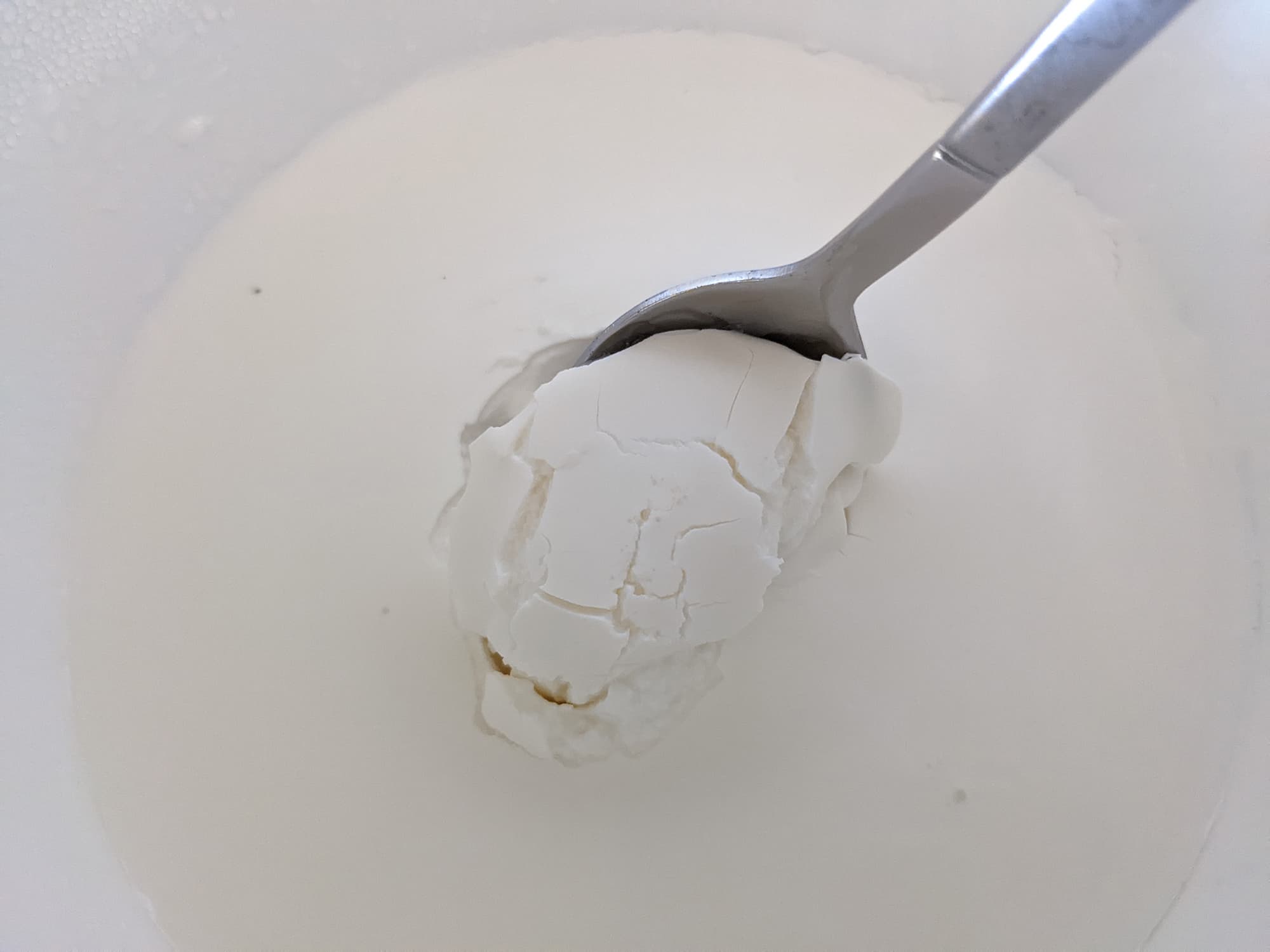 Из-за того, что молоко мы взяли пожирнее, в кефире у нас ложка если и не стояла, то очень медленно падала. Он получился плотный и густой — в самый раз для салатной заправки или прохладительного питья, если вы любите такую консистенцию. Но вот для холодного супа, пожалуй, нужно готовить более жидкий — для этого стоит взять менее жирное молоко или уменьшить время приготовления.