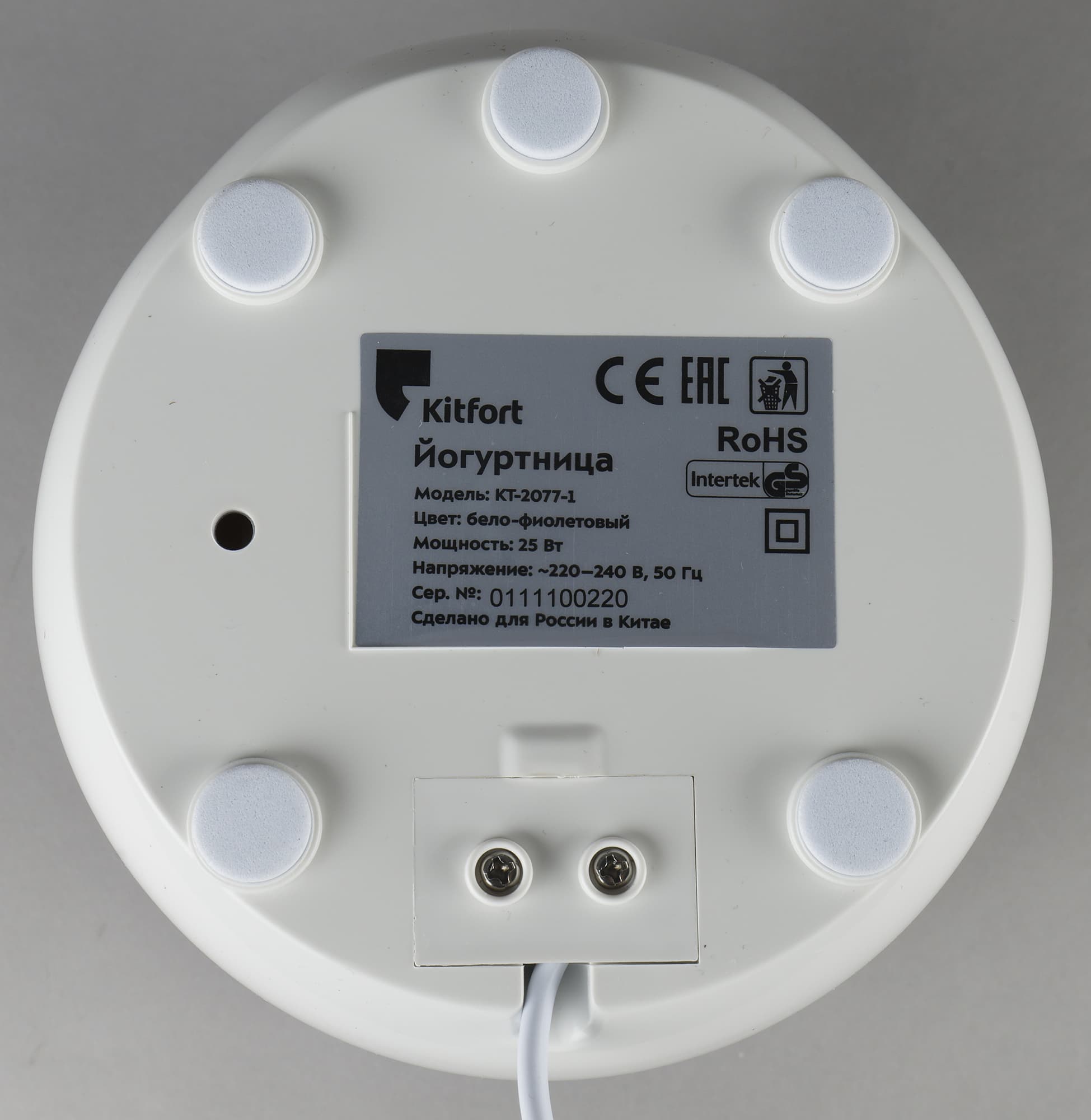 На дне у этой модели пять круглых ножек с противоскользящими накладками и шильдик с технической информацией. Шнур выходит из выреза в нижней поверхности. Он достаточно длинный, чтобы поставить прибор удобно и не слишком сильно зависеть от расположения розетки.