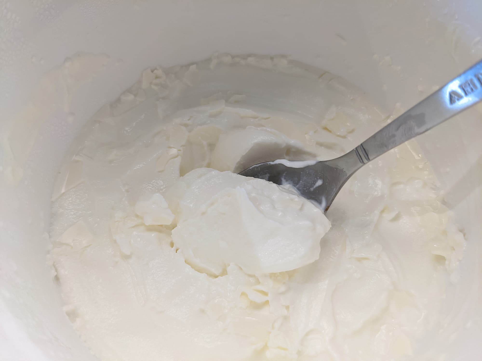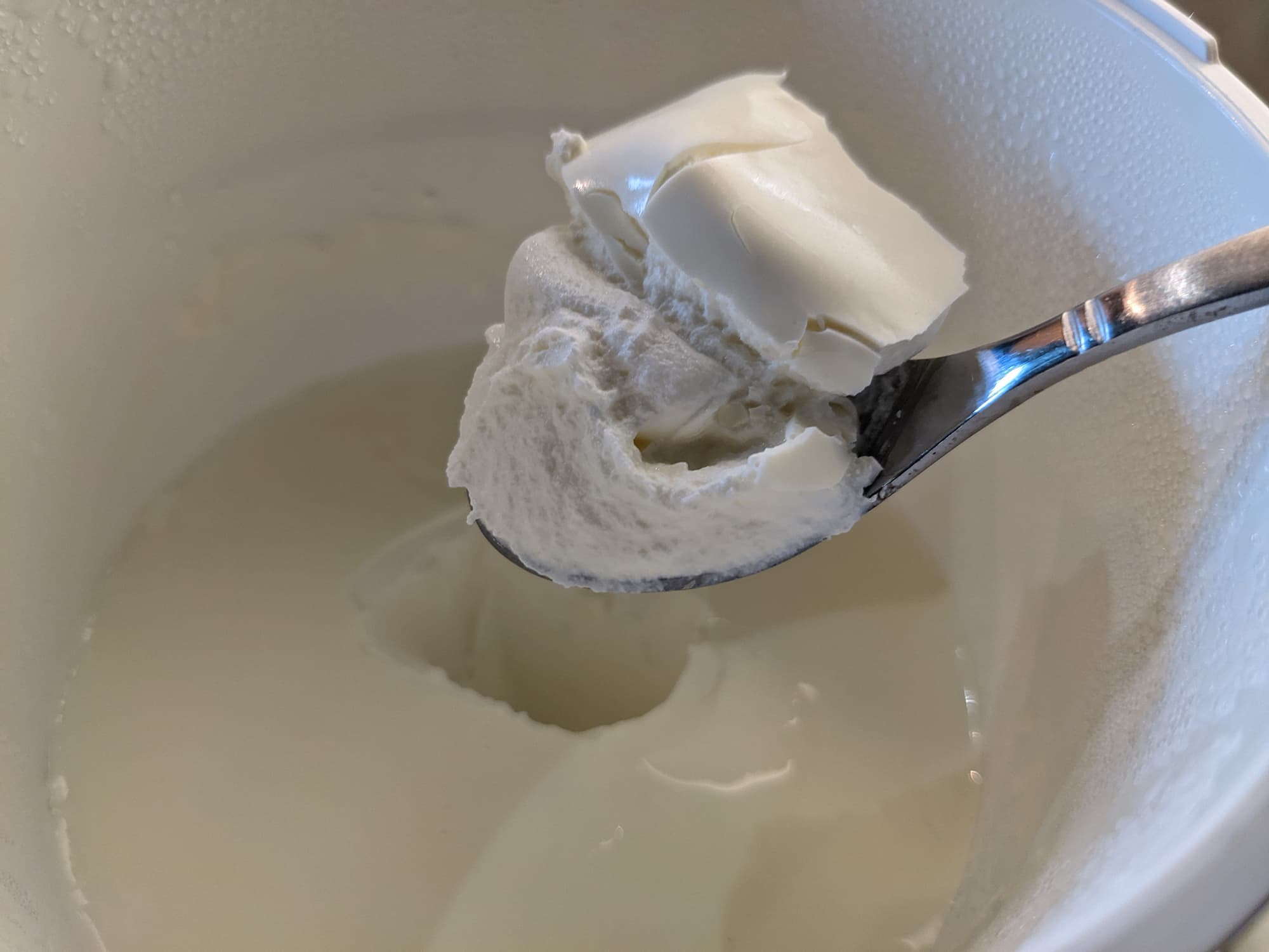А вот йогурт, на наш вкус, чем гуще, тем лучше. Поэтому для следующего теста мы взяли пол-литра сливок 20-процентной жирности и закваску для йогурта, нагрели, перемешали и поставили на программу С-1.